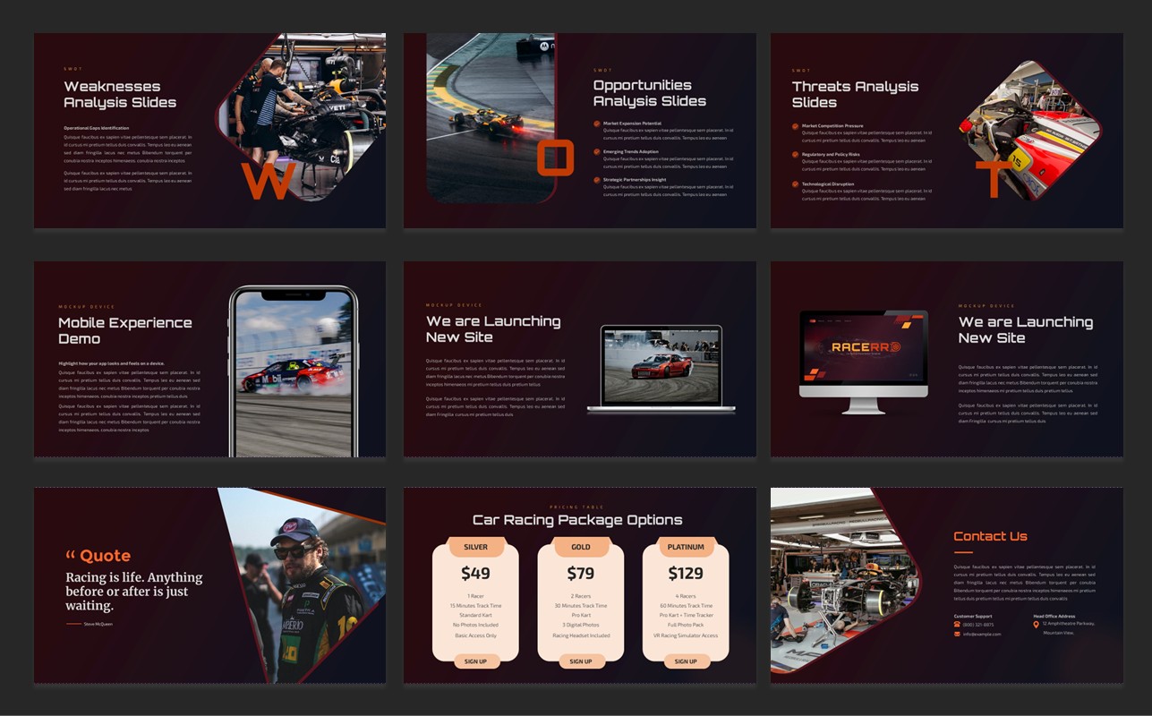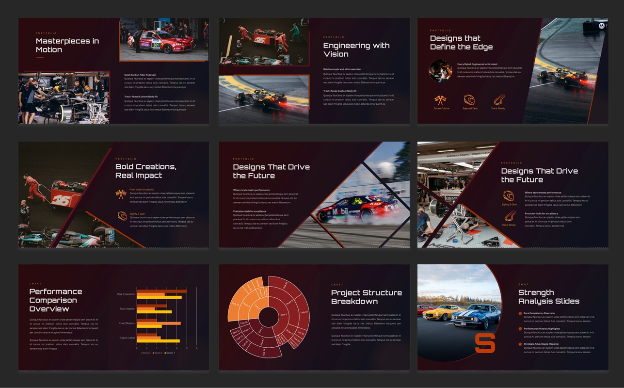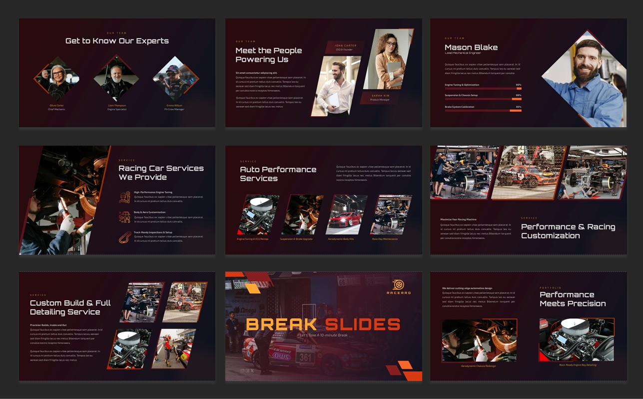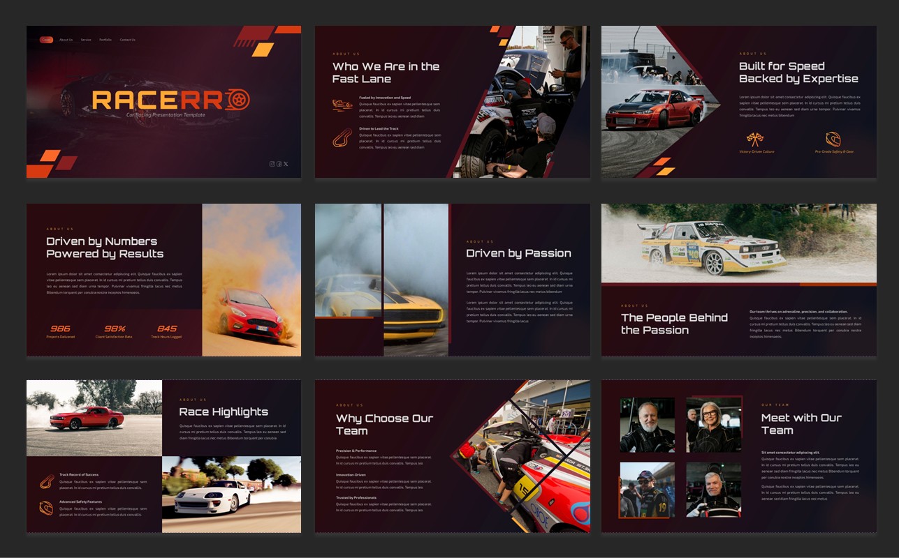 Start your engines and captivate your audience with Racerro, a sleek and dynamic presentation template built specifically for motorsport, car racing, and automotive-themed content. Designed with bold typography, striking visuals, and high-energy layouts, Racerro helps you deliver your message with speed and precision.