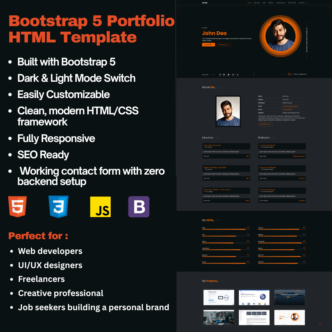 The template is created by HTML , CSS , JavaScript and Bootstrap. You can easily customise for your own.