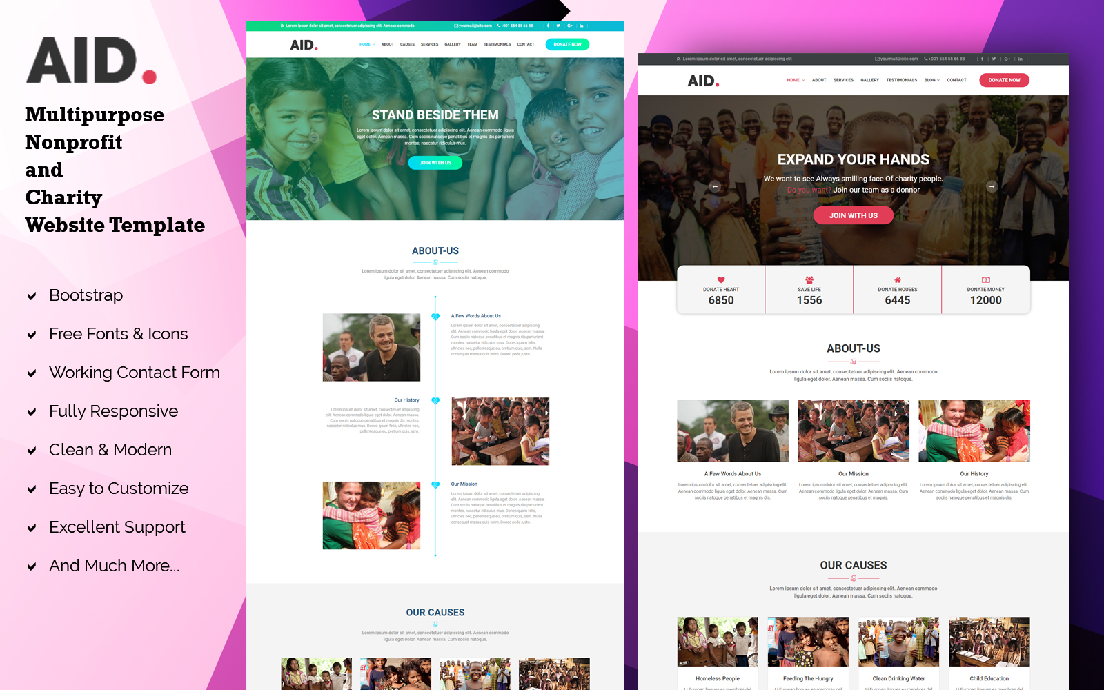 AID. is a Non-Profit Charity HTML Template. This bootstrap template specially designed for Non-Profit and Charity projects. It can be used for donation system, fund raising, crowdfunding campaigns, non-profit events, causes etc multipurpose website projects.