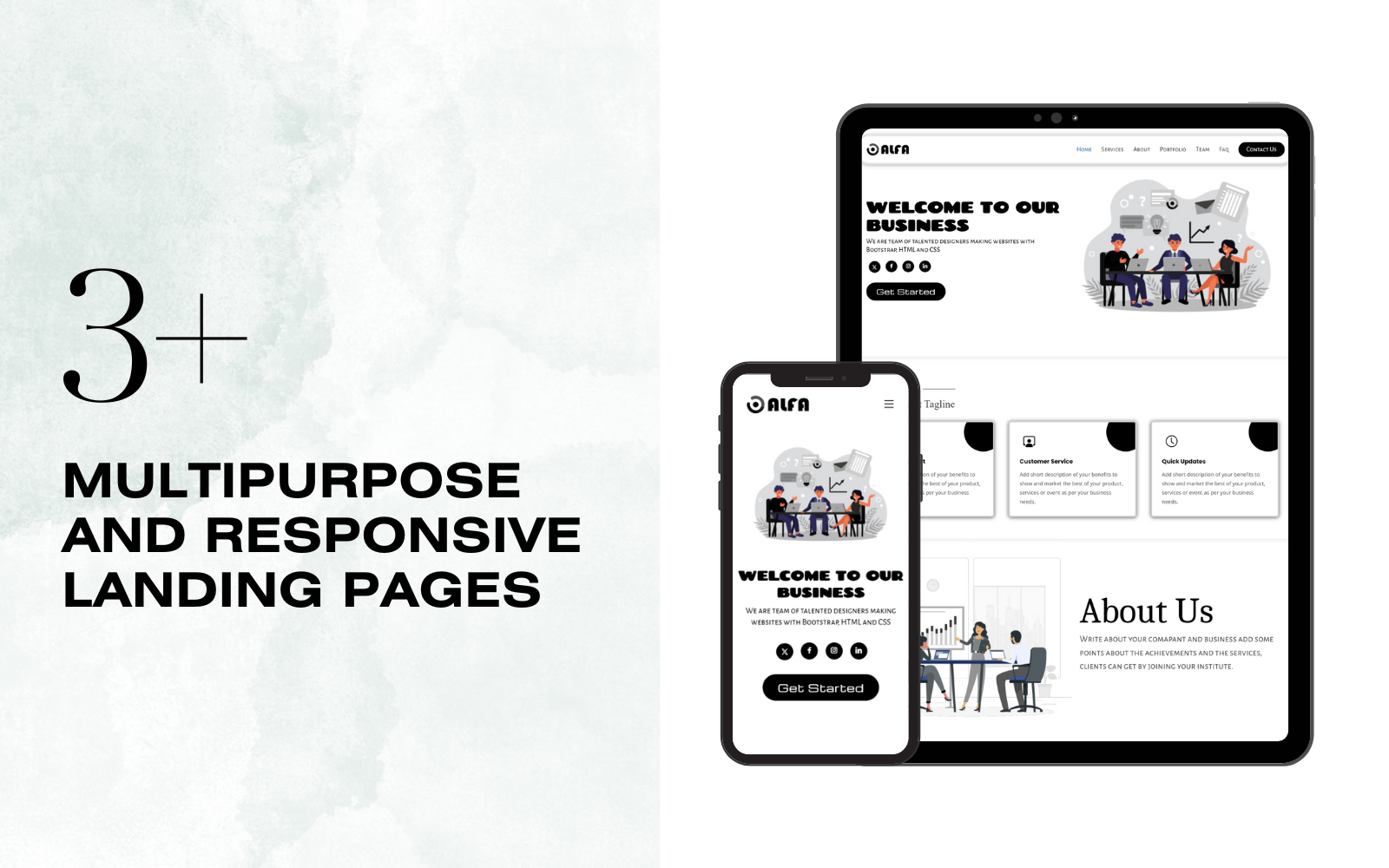 Transform your online presence with the Alfa Multipurpose Landing Page Templates, expertly crafted using the Bootstrap framework. Now featuring three distinct templates, Alfa provides versatile solutions for businesses in various industries such as education, consulting, technology, and more. Whether you're launching a new project or revamping an existing site, Alfa has the perfect design to suit your needs.