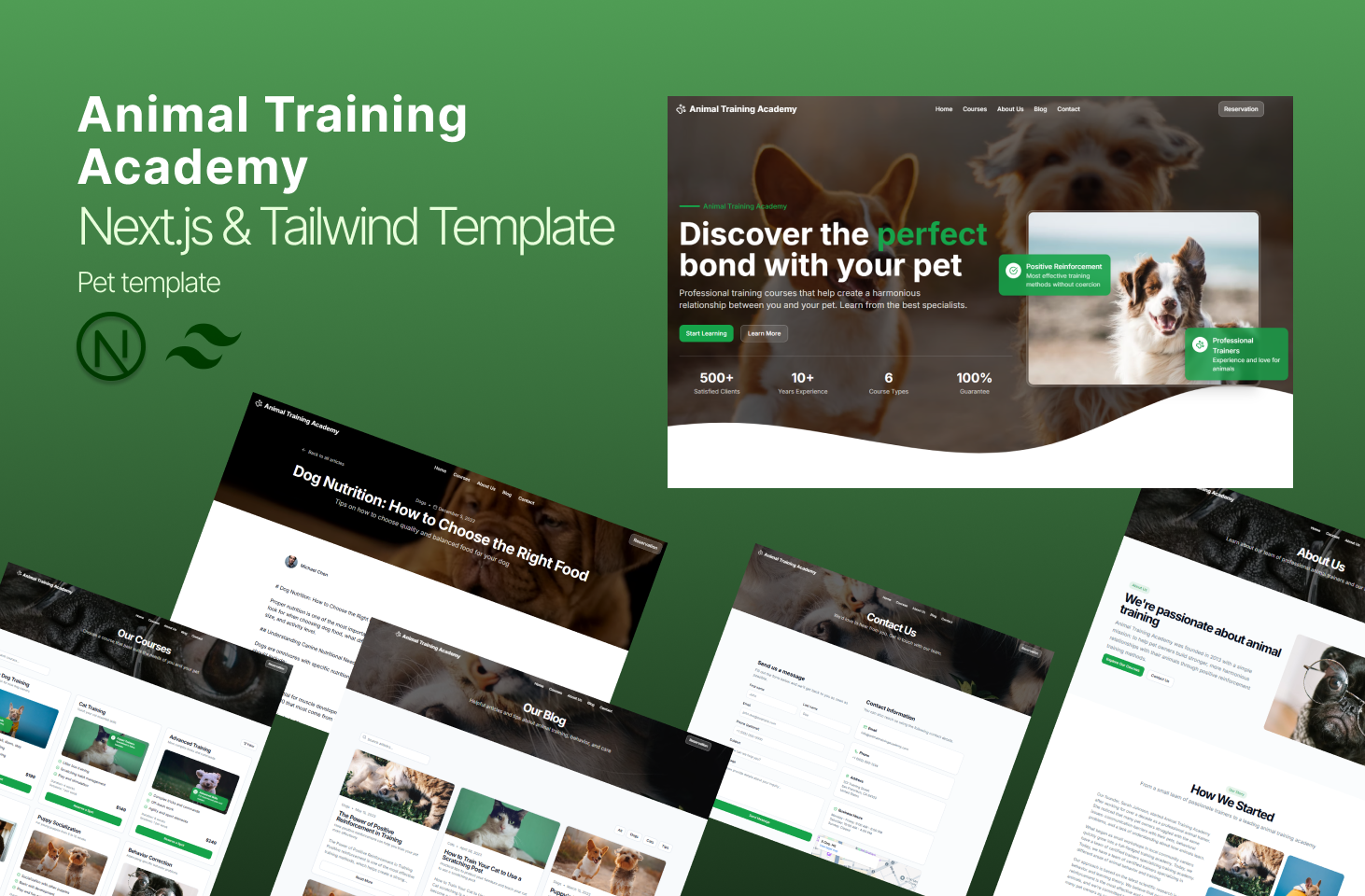 Introducing the Animal Training Academy template, specifically crafted for pet training professionals and animal enthusiasts. Built using the powerful Next.js framework and styled with Tailwind CSS, this template is an ideal solution for creating a highly functional and visually appealing website dedicated to animal training services.