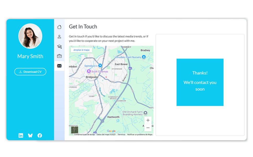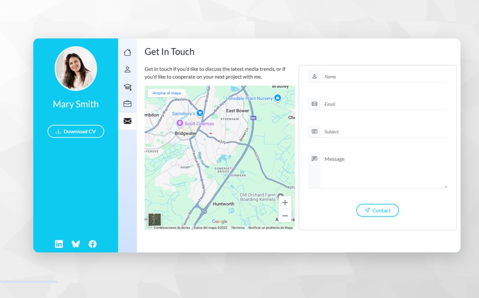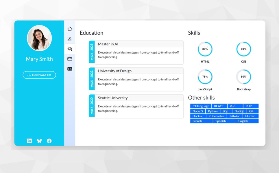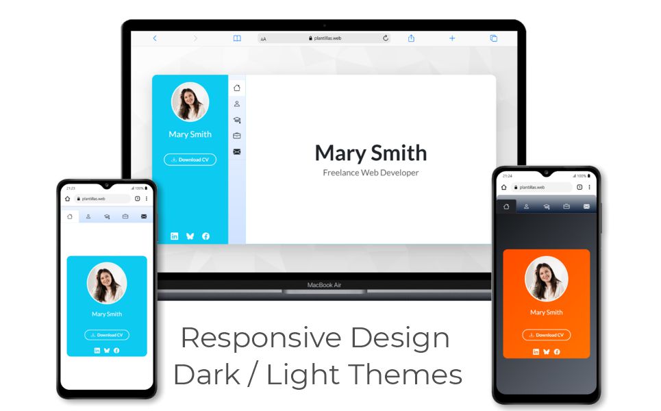 Users can seamlessly switch between two professional themes: light and dark mode, catering to different visual preferences and environments. The vCard is structured into intuitive sections including a photo sidebar with social media links and CV download, a navigation panel for quick access, and a main content area to showcase your personal details, skills, experience, and contact information.