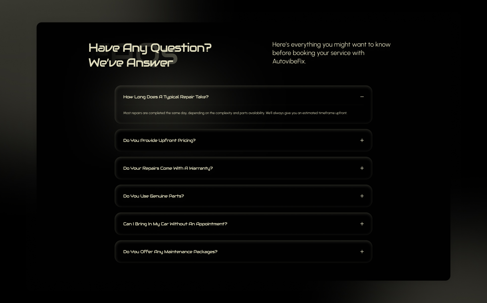 Developed with Next.js, AutoVibefix offers lightning-fast load times, smooth page transitions, and complete mobile responsiveness. This template includes essential sections for services, pricing, customer reviews, appointment booking, team introductions, and FAQs, making it easy to turn website visitors into loyal customers.