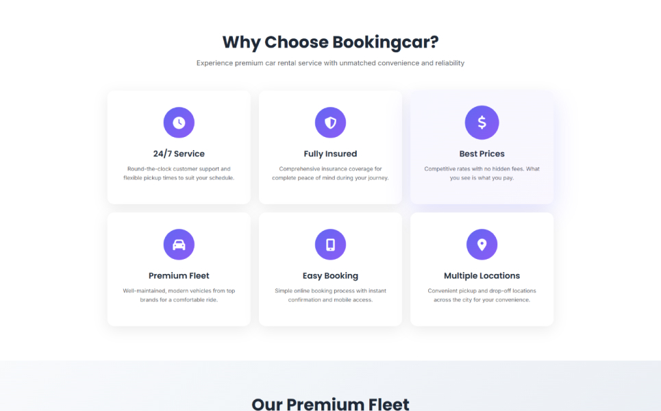 From showcasing your fleet with tailored display sections to highlighting customer feedback and transparent pricing plans, Bookingcar is designed to do more than just look good—it’s built to perform. Its lightweight structure and optimized code keep loading times short, while its clean design helps visitors focus on what matters: your cars.