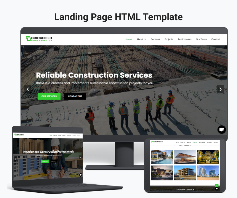 BrickField Construction is a premium HTML landing page template tailored for construction companies, contractors, engineers, and architectural firms. It features a modern and elegant layout, responsive design, and fast-loading optimized code. Built using semantic HTML5 and modular CSS3, the template includes smooth scroll animations, a lightbox portfolio gallery, animated counters, and a contact form integrated with FormSubmit. It is ideal for showcasing services, completed projects, client feedback, and team expertise across all screen sizes. Whether you're launching a new project or creating a company profile site, BrickField offers a clean and professional solution.