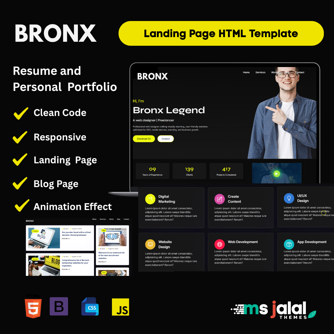 Bronx – Personal Portfolio Landing Page HTML Template modern and fully responsive HTML template designed for creative professionals, freelancers, designers and developers. With clean code and an eye-catching layout, Bronx offers an elegant and professional way to showcase your work, skills, and personal brand. This template includes multiple sections such as Services, Projects, Skills, Testimonials, Blog and Contact. Blog Page and Single Blog details page also included this template. It features smooth scrolling, interactive animations, and a responsive design that looks stunning on all devices—from desktops to smartphones. Bronx is built using the latest technologies like HTML5, CSS3, JQuery and Bootstrap, ensuring fast performance and compatibility across all major browsers.
