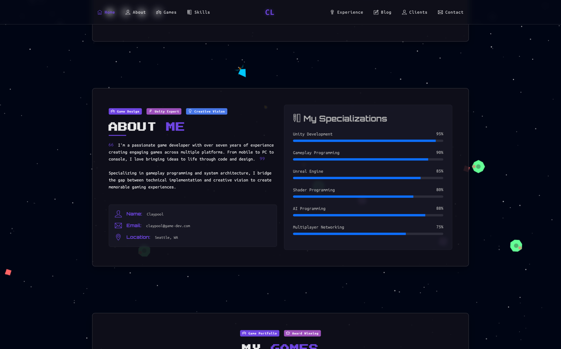 Claypool - Professional Game Developer Portfolio Template. Elevate your game development portfolio with Claypool, a stunning HTML template designed specifically for professional game developers. This template features an immersive space shooter game background created with p5.js, where your visitors can witness a dynamic cosmic battle with spaceships and alien enemies—just like classic arcade shooters!