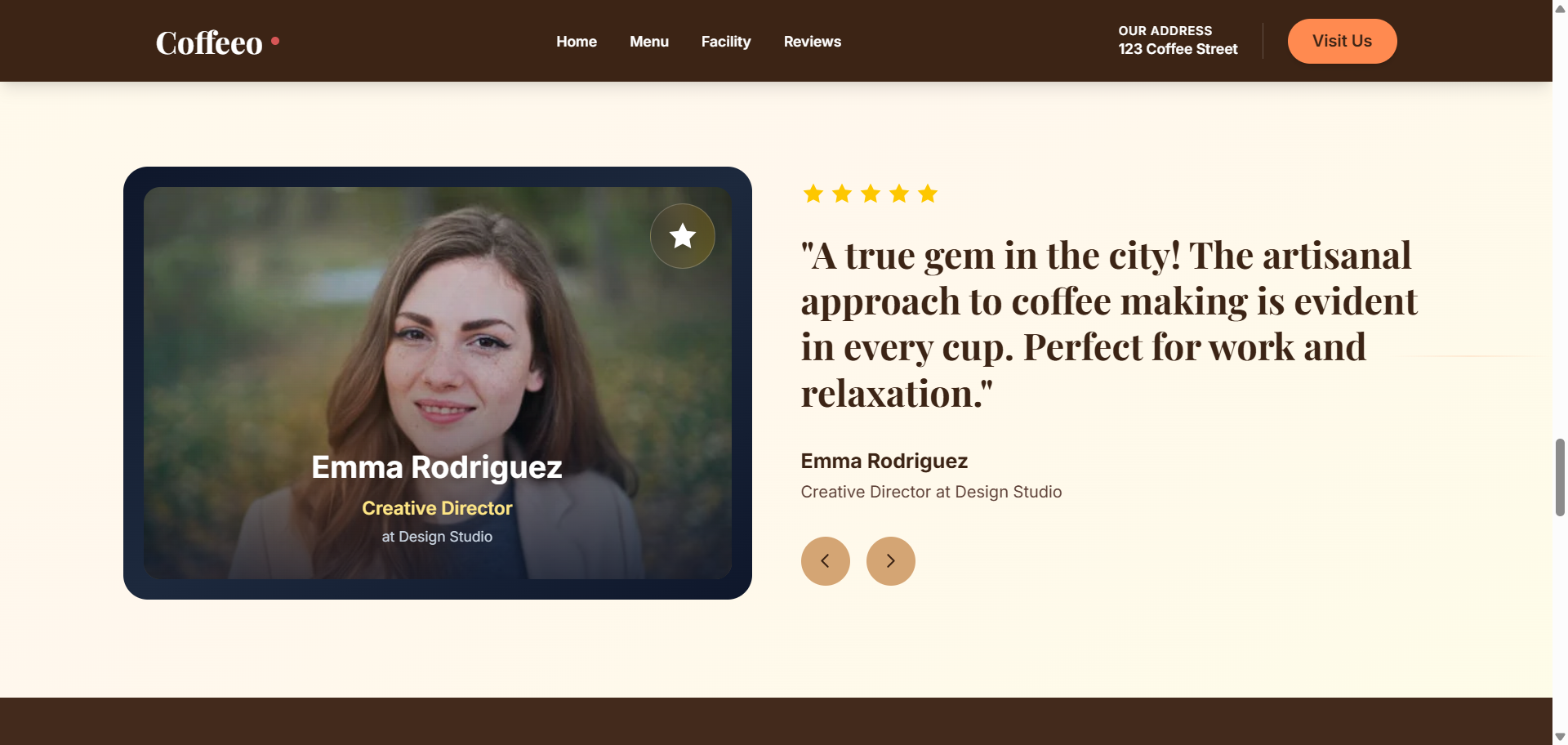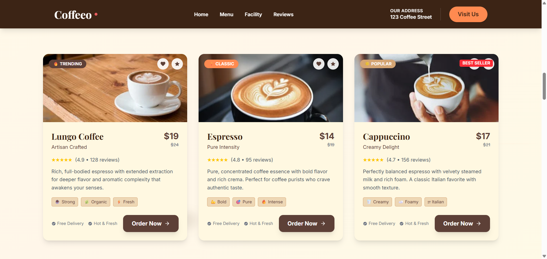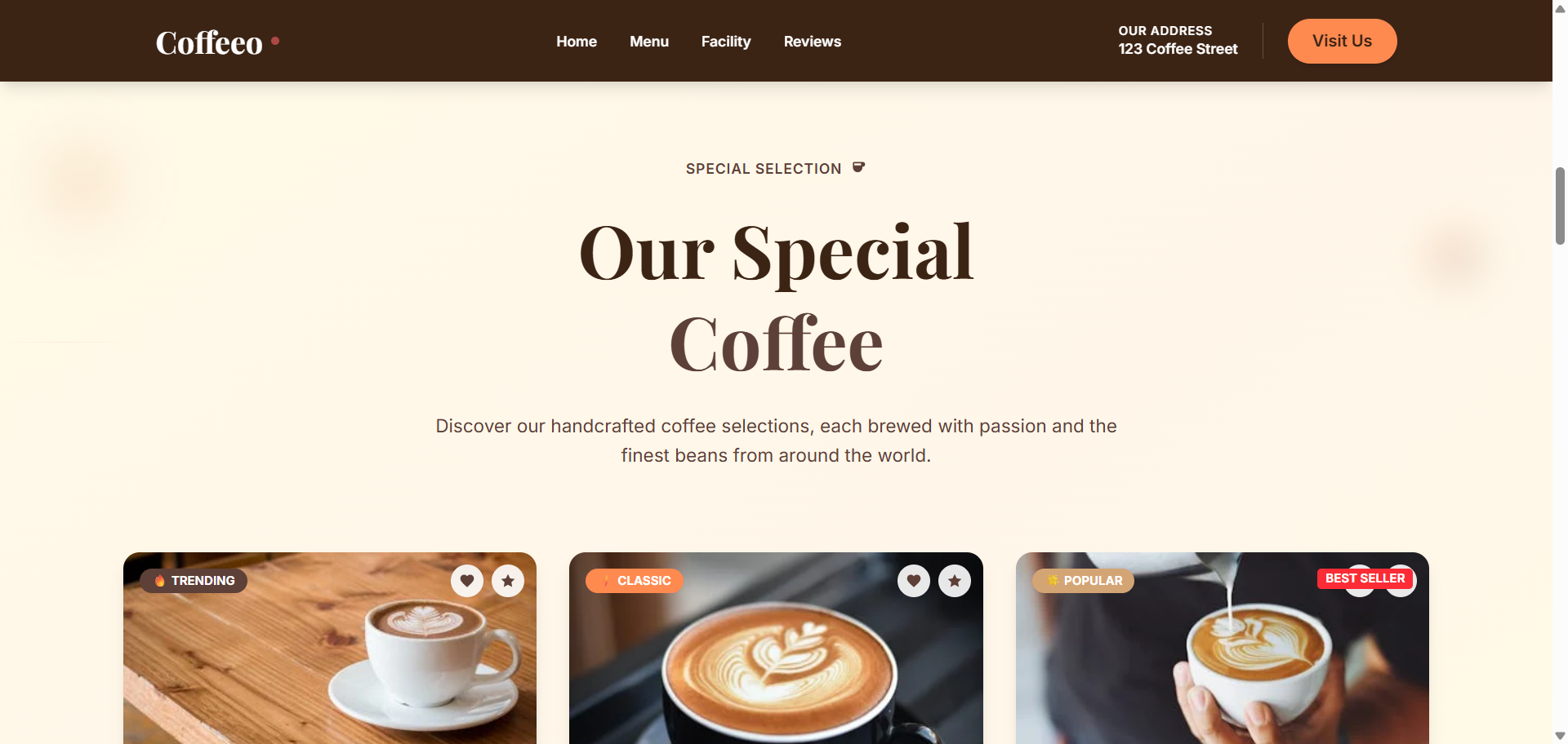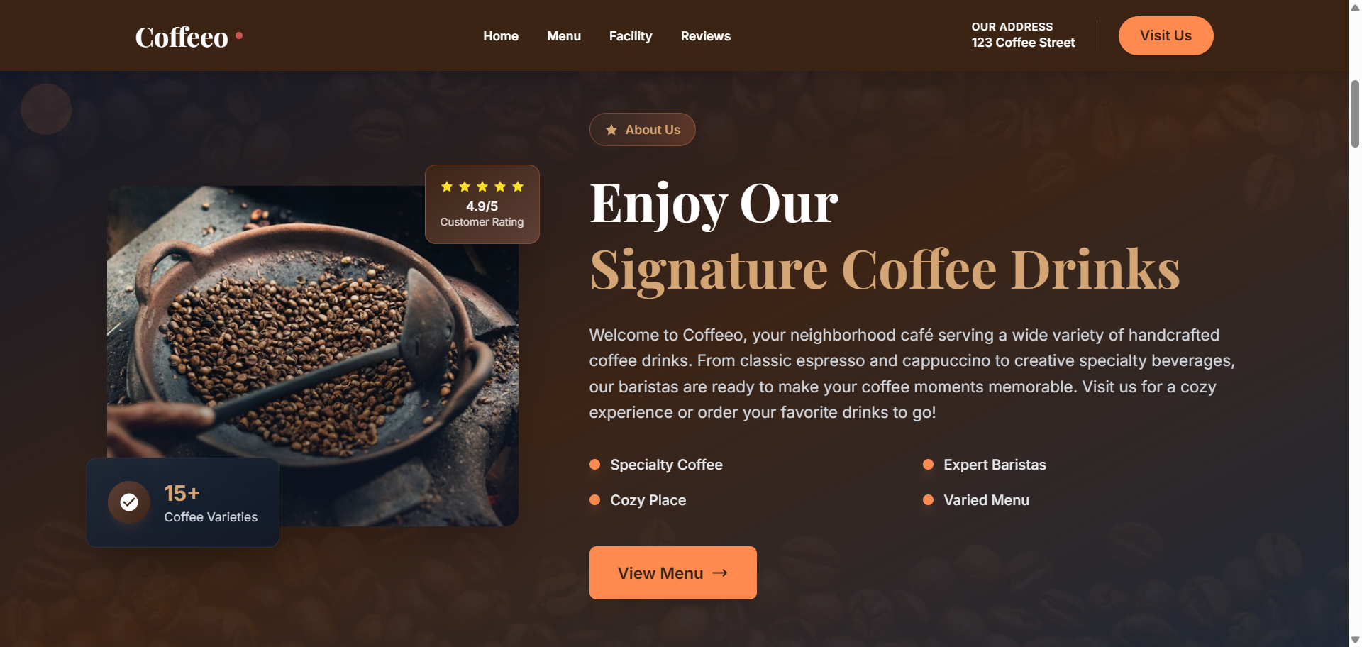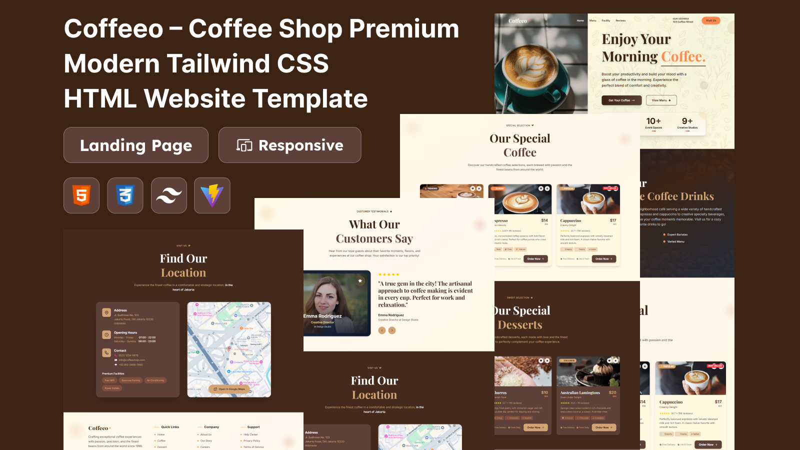 A modern, responsive coffee shop landing page template built with Tailwind CSS and vanilla JavaScript. This elegant template features a sophisticated design with warm coffee-themed color palette, perfect for coffee shops, cafes, and beverage businesses. The template includes product showcase, customer testimonials, location details, and contact information. Built with performance in mind, it features smooth animations and mobile-first responsive design. Perfect for coffee entrepreneurs looking to establish a professional online presence.