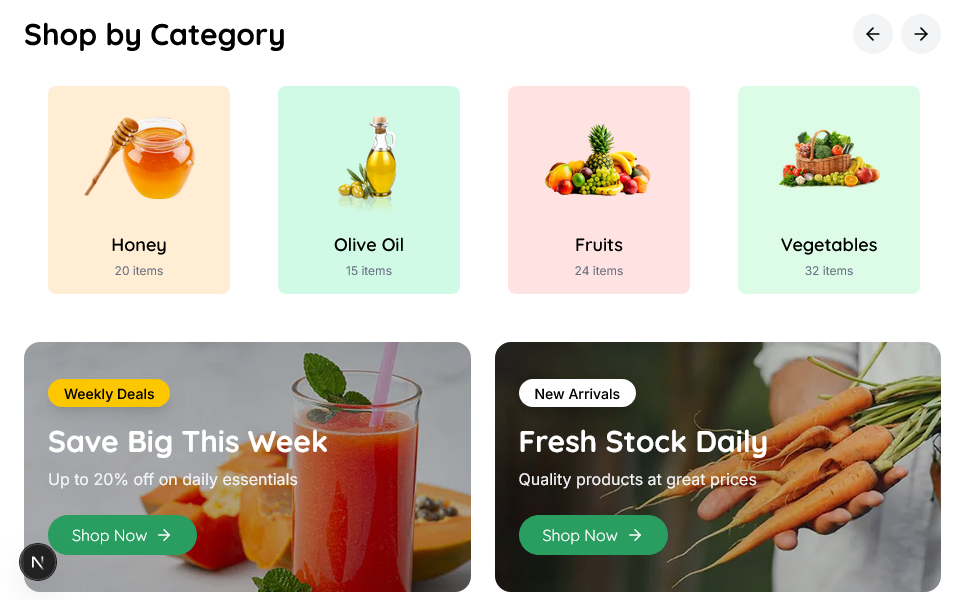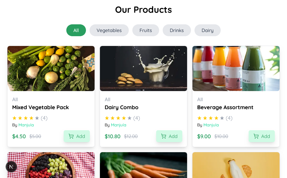 - Dynamic Product Filtering: Effortlessly filter products by categories such as Vegetables, Fruits, Dairy, Drinks, and more, ensuring a smooth shopping experience for your customers.