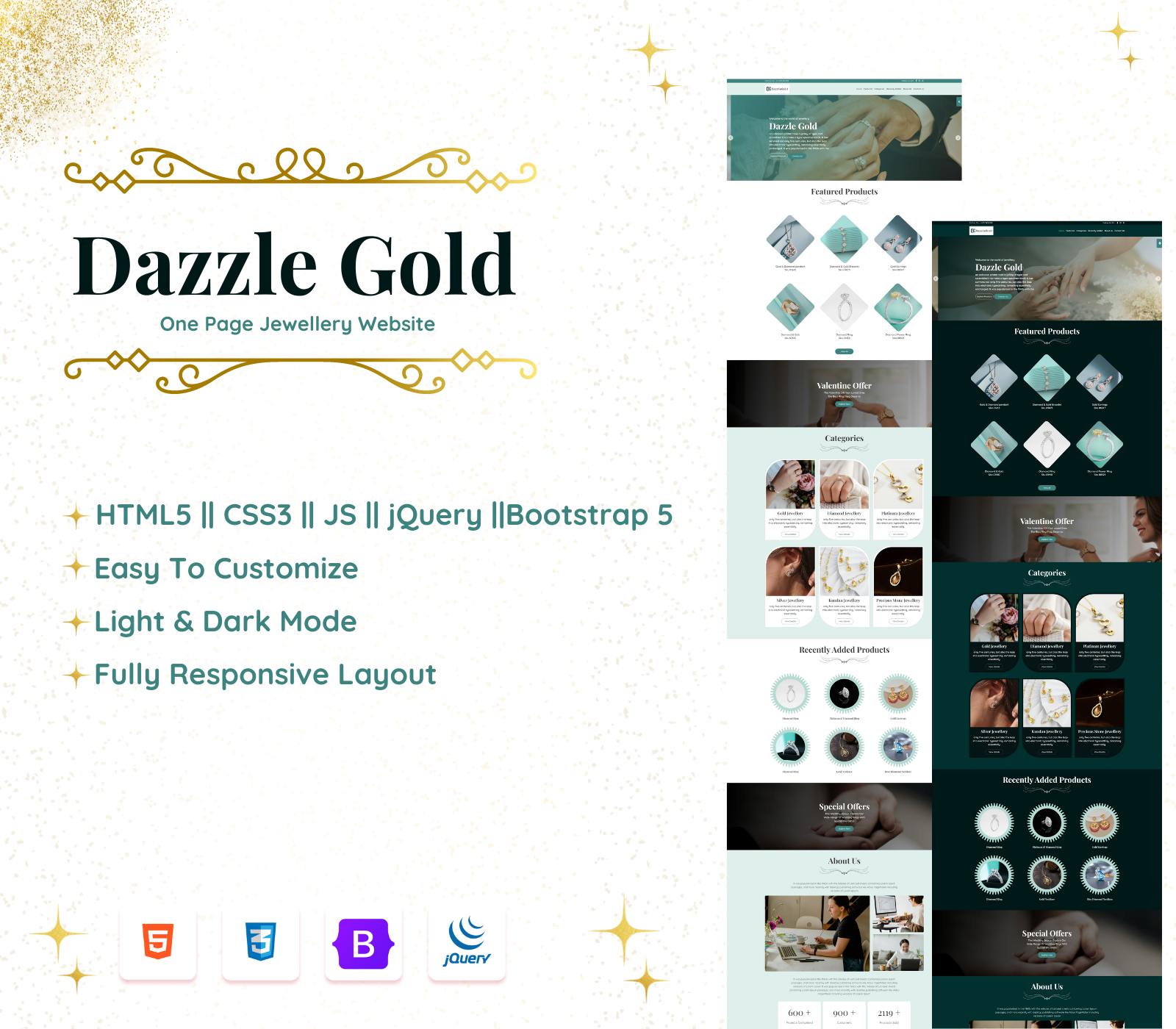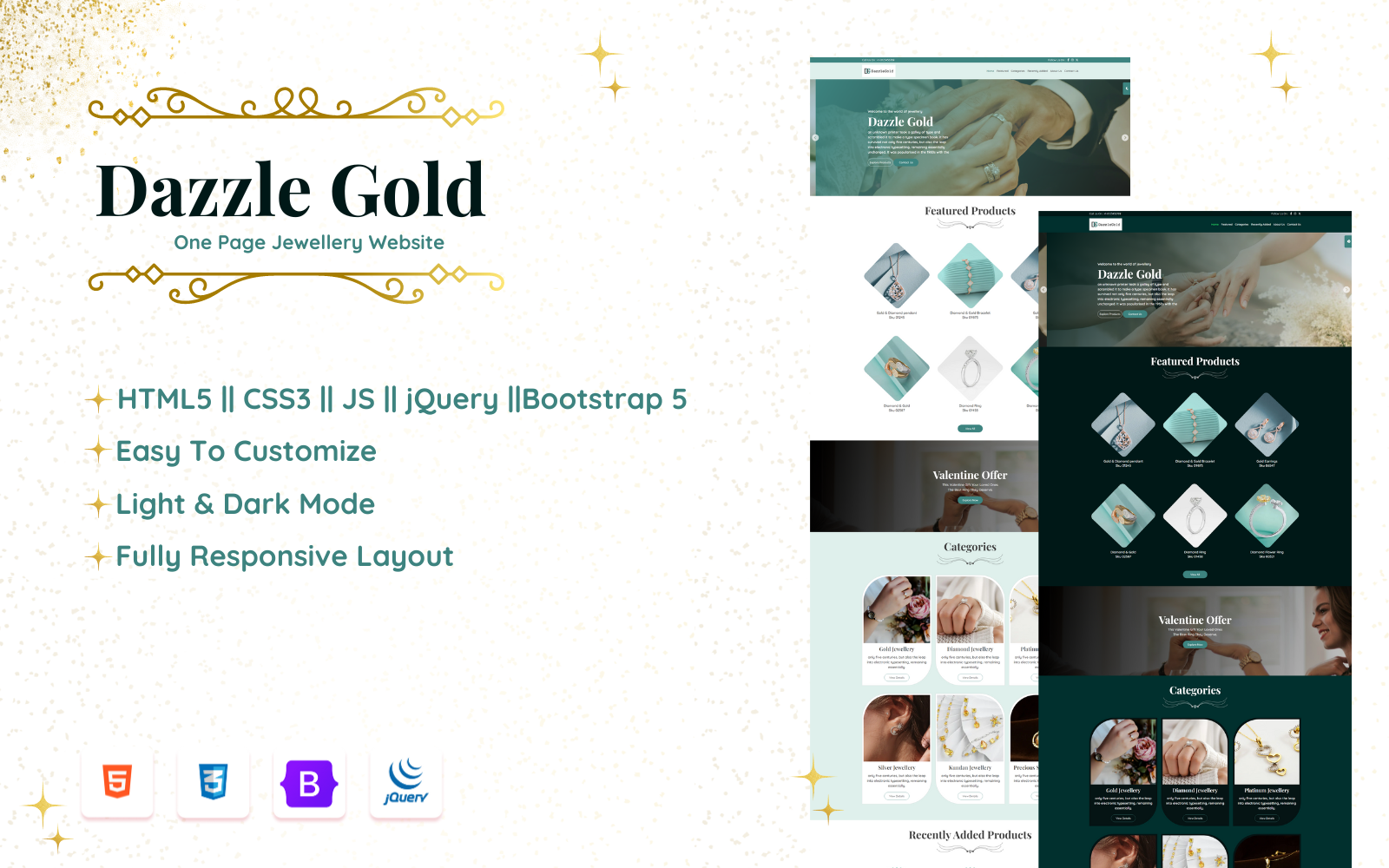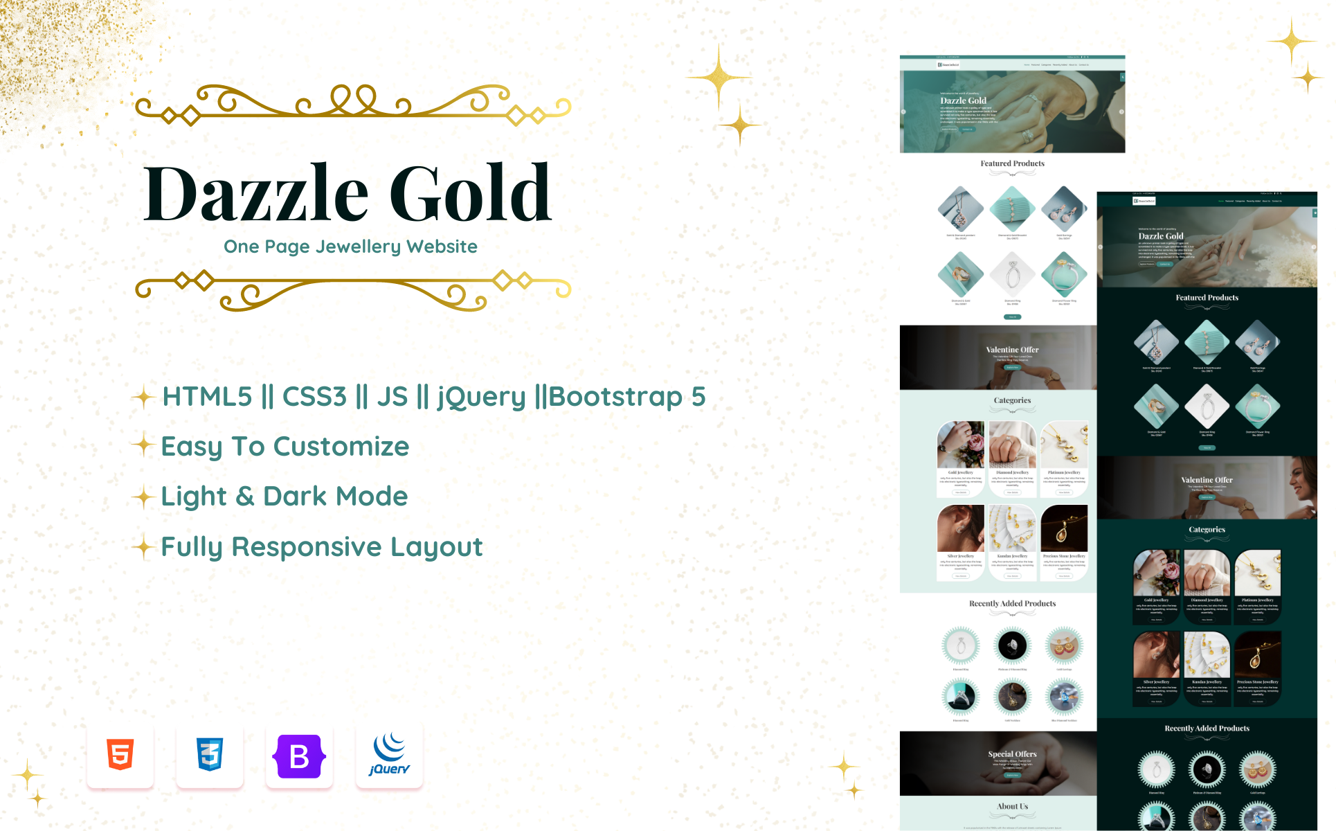 Shine bright with this beautifully crafted single-page HTML website template, designed specifically for Jewelry businesses aiming to create a dazzling online presence. Built with HTML, CSS, JavaScript, jQuery, and Bootstrap 5, this template is fully responsive, modern, and user-friendly. It features both dark and light mode functionality, allowing your website to adapt seamlessly to user preferences. Whether you're showcasing luxury collections or trendy pieces, this template will ensure your brand stands out beautifully across all devices.