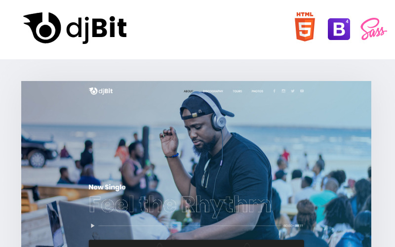 With djBit Landing Page template, you can also present your upcoming tours. Easily inform the audience about locations and spots where you will be performing. You can also inform your fans about the event schedule and sell tickets. There are social options too and you can use them to keep in touch with your fanbase. Besides, the template also offers:
