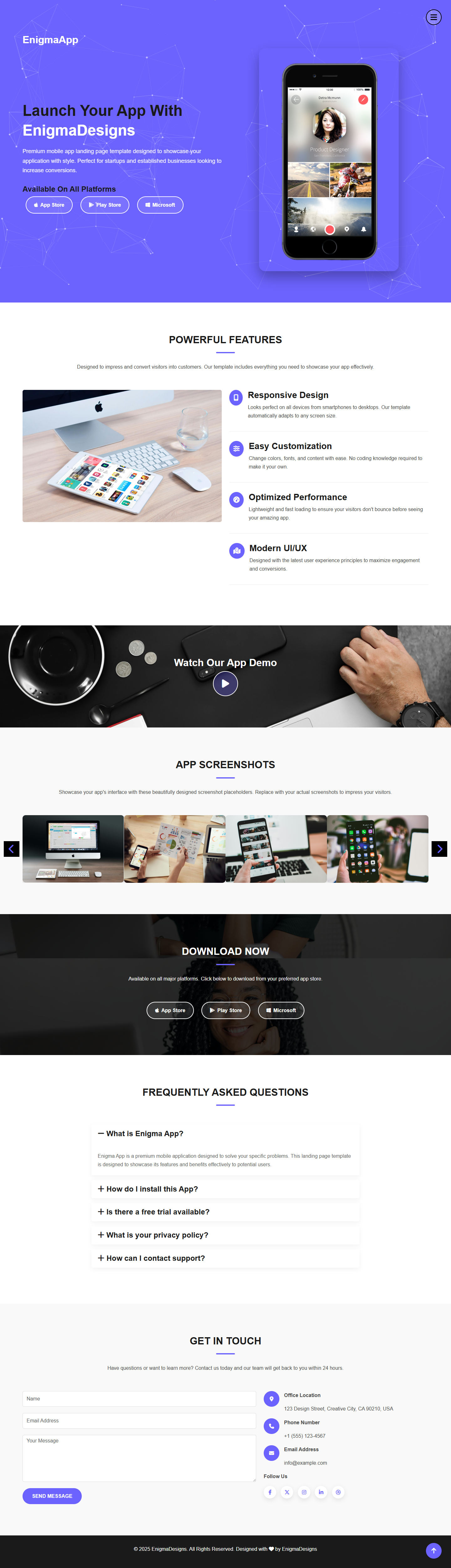 Launch your mobile app in style with Enigma App, a sleek and modern landing page template carefully crafted to boost conversions and showcase your application’s true value. This responsive HTML template is built with the latest Bootstrap v5.3.8 framework, ensuring perfect responsiveness across desktops, tablets, and mobile devices. Designed with startups, SaaS products, and mobile developers in mind, Enigma App combines clean aesthetics with powerful UI components to help you stand out in today’s competitive digital landscape. Whether you need to highlight app features, share demo videos, display screenshots, or capture leads through a professional contact form, this template provides everything you need in one package. Easy to customize, lightweight, and SEO-friendly, it’s an ideal choice for tech companies and entrepreneurs who want a professional online presence that converts visitors into users.