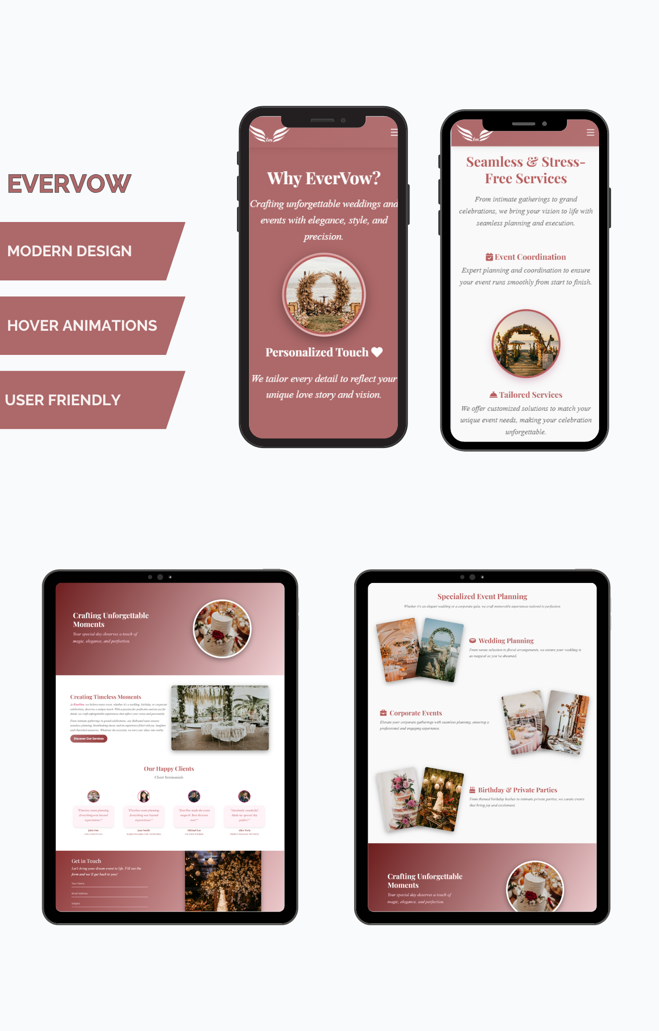 Whether you're planning timeless weddings, upscale parties, or grand corporate events, EverVow provides the perfect digital presence to showcase your expertise and attract high-end clients.