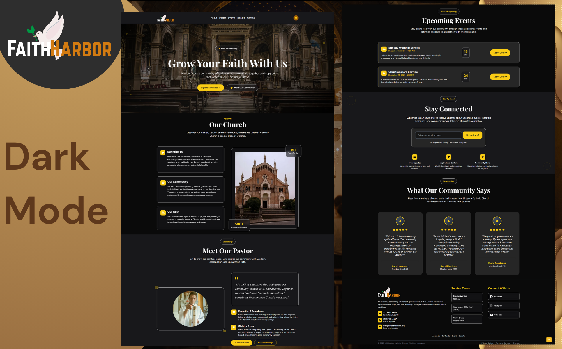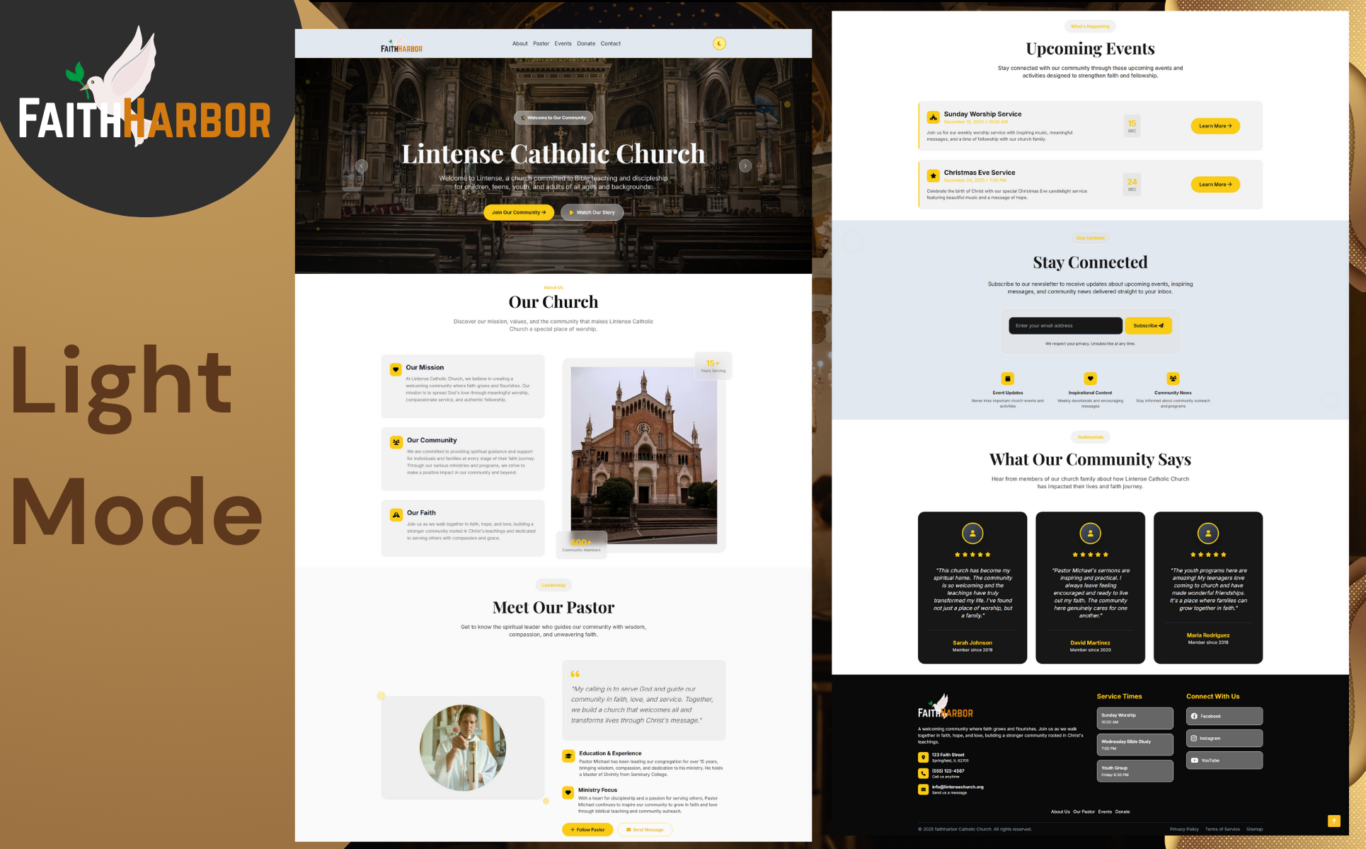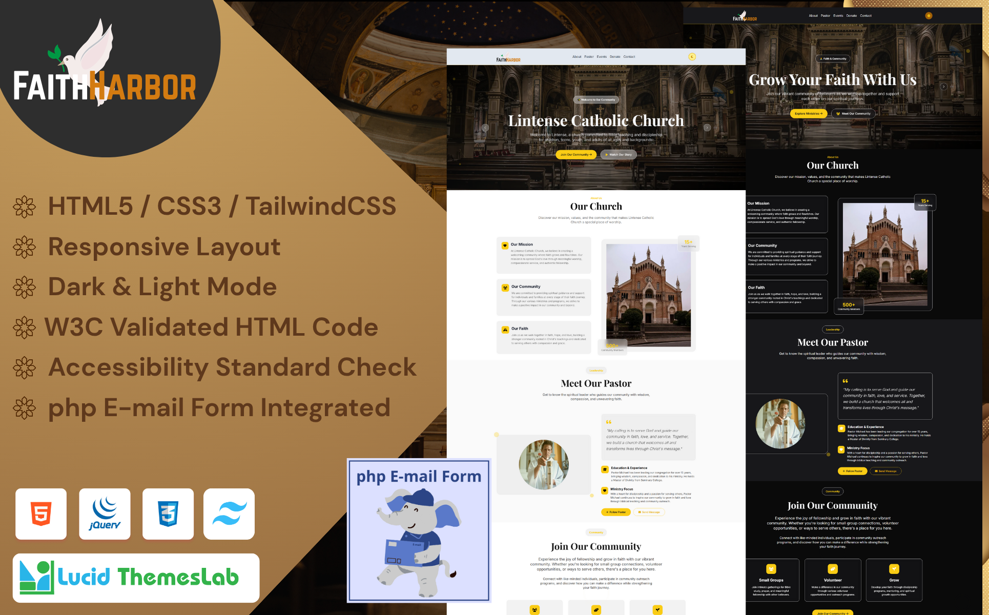 FaithHarbor is a modern, fully responsive landing page template designed for churches, ministries, charities, and non-profits. Built with Tailwind CSS and integrated with working PHP contact and donation forms, it ensures fast performance and easy customization. Featuring sections for About, Pastor, Community, Events, and Testimonials with dark/light mode support, FaithHarbor helps organizations build a meaningful online presence and connect with their community.