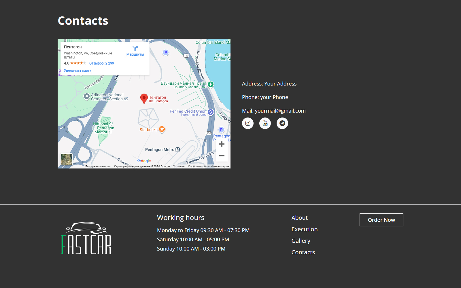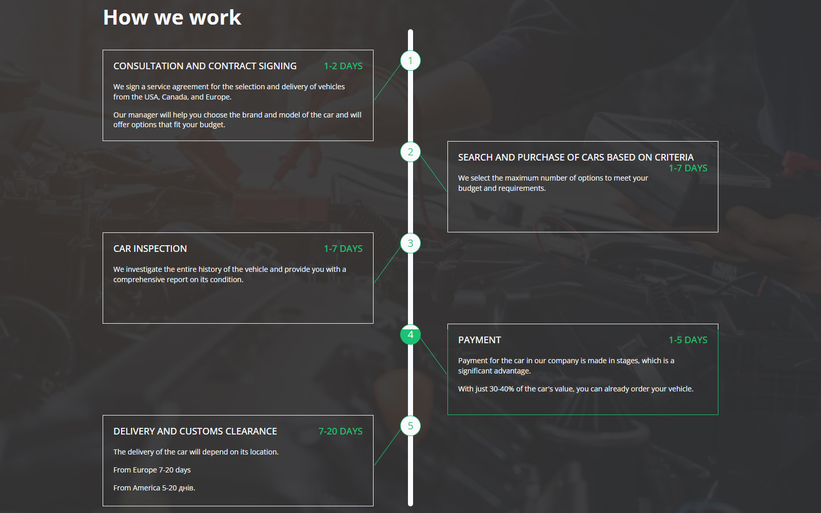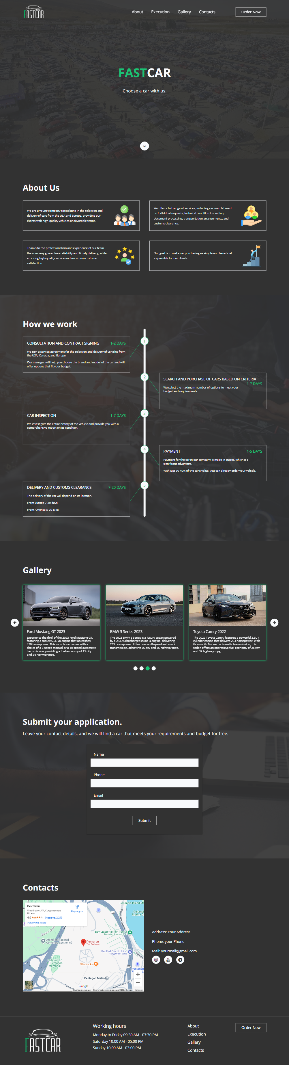 Almost every day there is a new company related to cars.The fastcar template is designed specifically for companies that sell and deliver cars to customers from America and Europe. As soon as a potential customer goes to the site, they will immediately see a minimalist design that combines a beautiful palette of green and dark gray collar.On the page you can see a comfortable menu, when you click on its items, you immediately scroll to the desired section.The welcome block shows the name of your company, a short description and a button that allows you to quickly go to the next section. The "About Us" section is designed to easily provide information about the company.The next section "How we work" will present the process of work execution, its stages. The "Gallery" block is intended for reviews, you can place your videos, the name of the order, and its description there. The next and one of the main sections is the feedback form, where your customers can leave their details so that you can contact them. The "Contacts" section is intended for intimacy with customers. You will show them where your office is located, direct them to your social networks and provide access to ways to contact you. In the basement of the site, we made a repetition of the cap and added a work schedule.