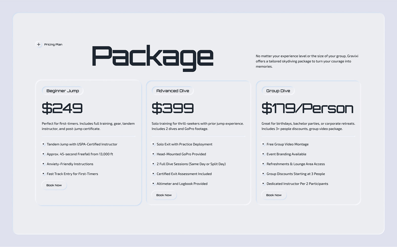 Whether you're offering tandem jumps, training sessions, or group bookings, Gravixi makes it easy to showcase your services and get more clients.