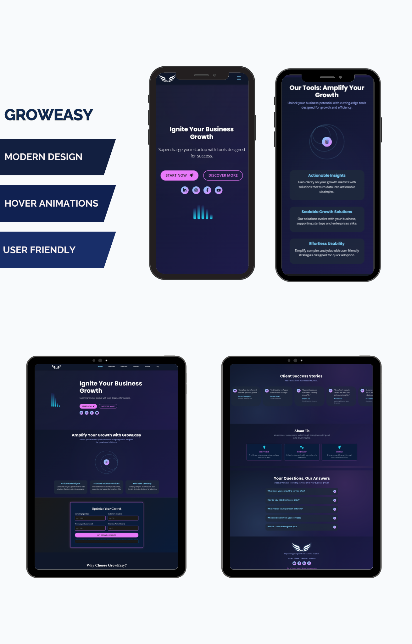 With optimized functionality and a clean, intuitive layout, GrowEasy lets you present your services, share client success stories, and integrate essential tools seamlessly. Built for speed and mobile-friendliness, your website will provide a flawless experience across all devices—desktop, tablet, or smartphone.