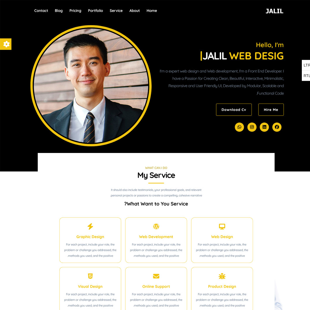 Jalil Personal CV/Resume Template fresh and clean Design. You can use this portfolio template for: personal portfolio, photography studios, painter portfolio, artworks, art, artist portfolio, web design works, illustrators, trainer, projects, freelance designer. Just take the best Template of your choice, change the text, add your images and done! we have a strong support team which 24/7 days available to support you.