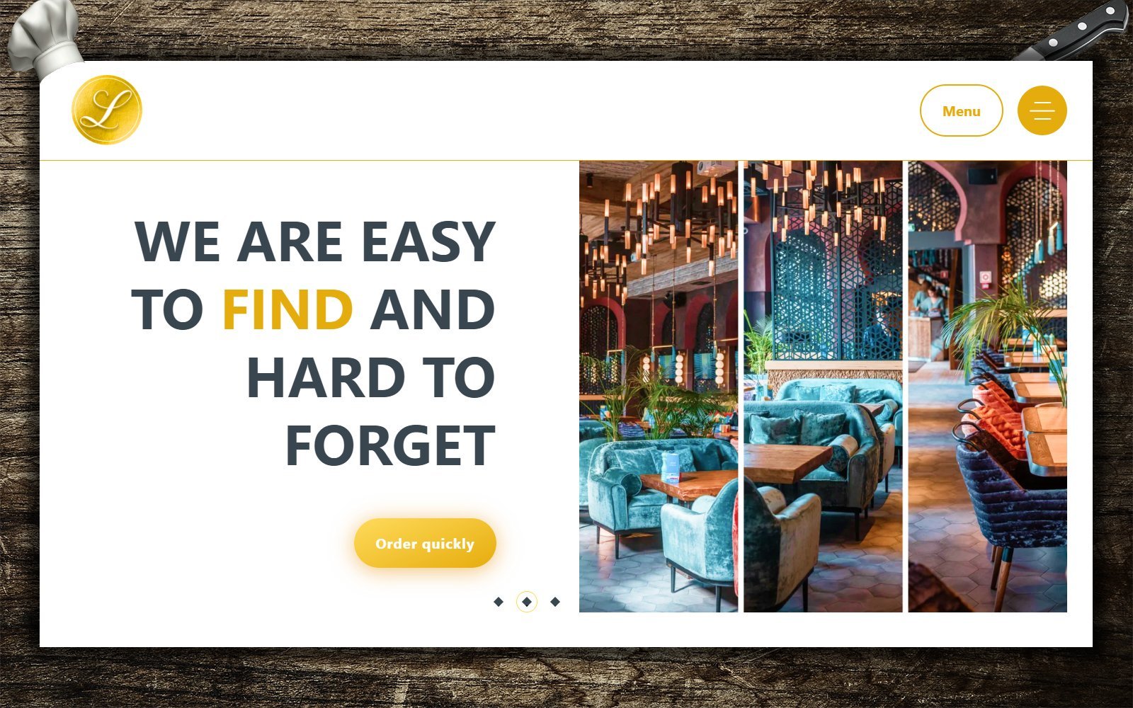 The template is made in the most interesting modern style. Suitable for a restaurant of any cuisine. As soon as a potential buyer enters the site, he will immediately be able to see a beautiful logo, a button that leads to the restaurant menu and site navigation. The first block is a slider on which you can place interesting promotions, a few good dishes and useful information about your restaurant. This is followed by a block with a detailed description of the menu. It can also accommodate several interesting restaurant dishes. The main block on the site is the menu. It is made with a switch. That is, you can add any number of products. The website also has a block with chefs, an order form and a map.