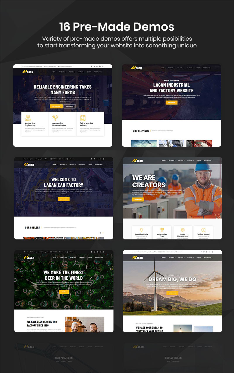 Lagan - Multipurpose Industrial & Factory template developed specifically for all types of industry, engineering or machinery businesses. It has very clean code, powerful documentation and easy to use features. It is also highly customizable SEO friendly template. We designed our template with high level professionals.