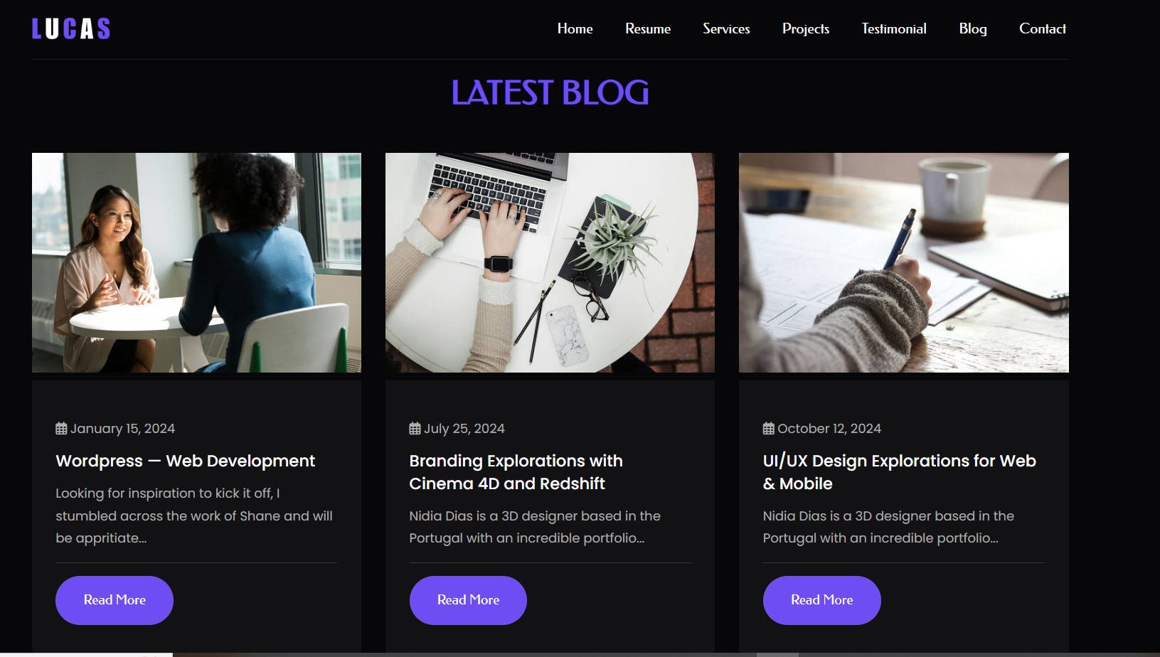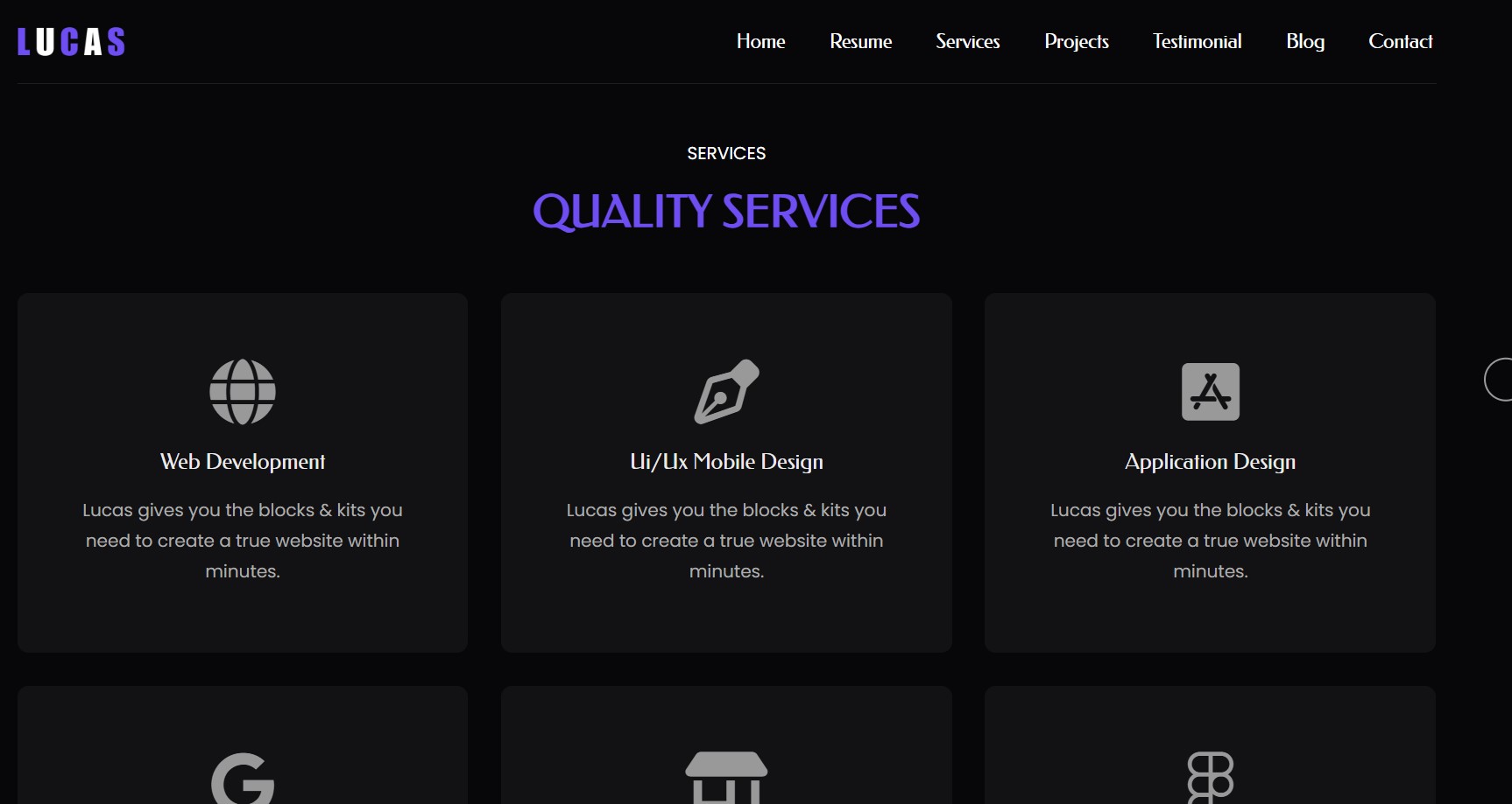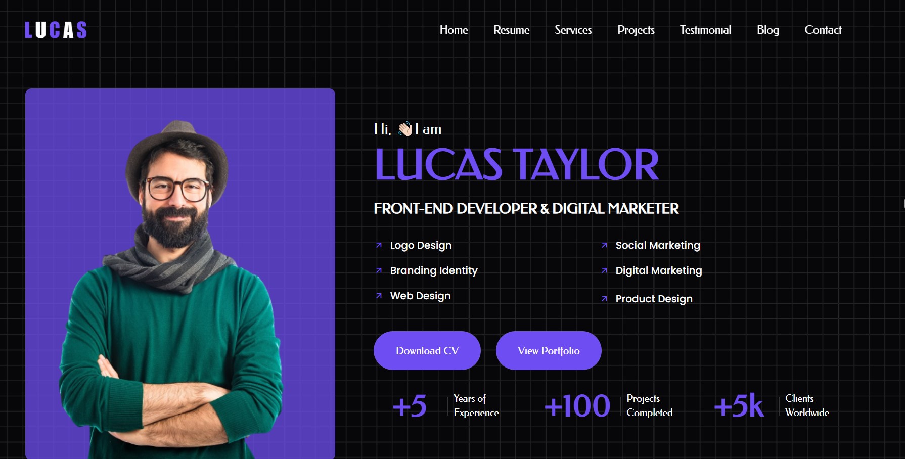 Lucas Personal Portfolio HTML Landing Page is a modern and fully responsive web template designed to showcase individual talents and professional achievements. With a clean, minimalist layout with About, Resume, Services, Projects, and Contact. Perfect for developers, designers, freelancers, digital marketer. Lucas features smooth animations, fast loading speed, and SEO-optimized structure.