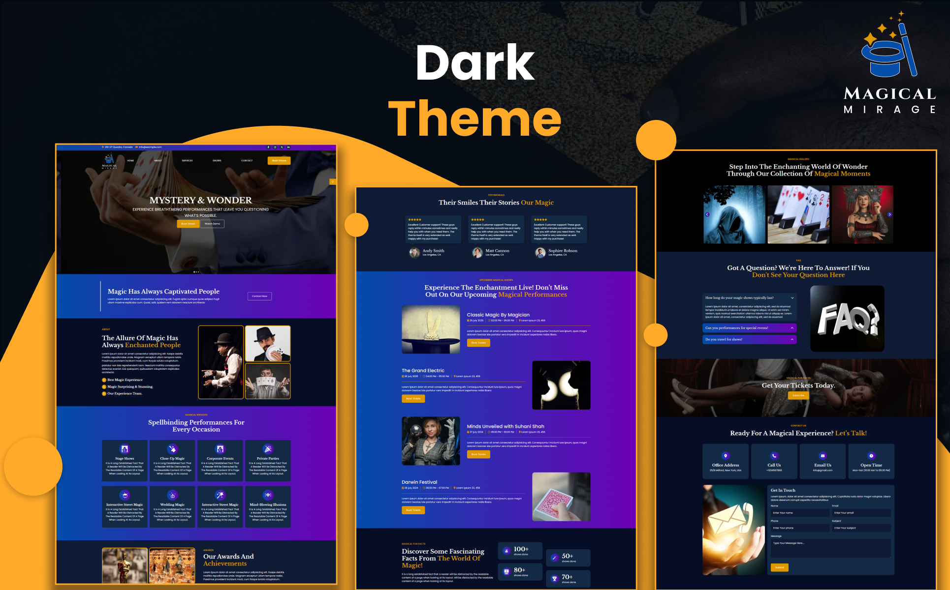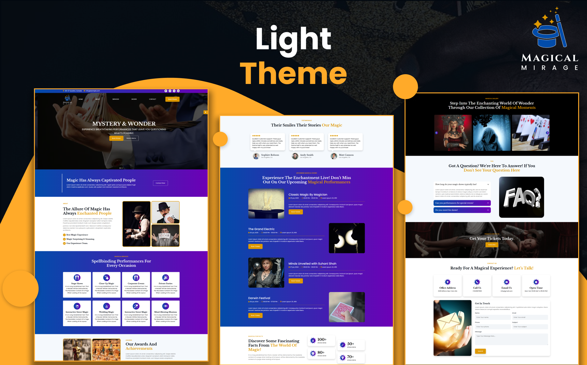 Magical Mirage is a spellbinding one-page HTML5 website template designed for professional magicians, illusionists, entertainers, and live performance artists who want to leave a lasting impression online. Built with the powerful Bootstrap 5 framework along with HTML5, CSS3, and JavaScript, this template offers a captivating layout with smooth scrolling navigation and a magical light/dark mode toggle. Its immersive single-page design allows visitors to explore your story, services, shows, and contact details in one seamless journey, enriched with elegant animations, interactive sliders, and visual storytelling. From showcasing dazzling magical acts to promoting upcoming events, Magical Mirage delivers a modern, mobile-optimized, and performance-focused platform to elevate your magical brand.