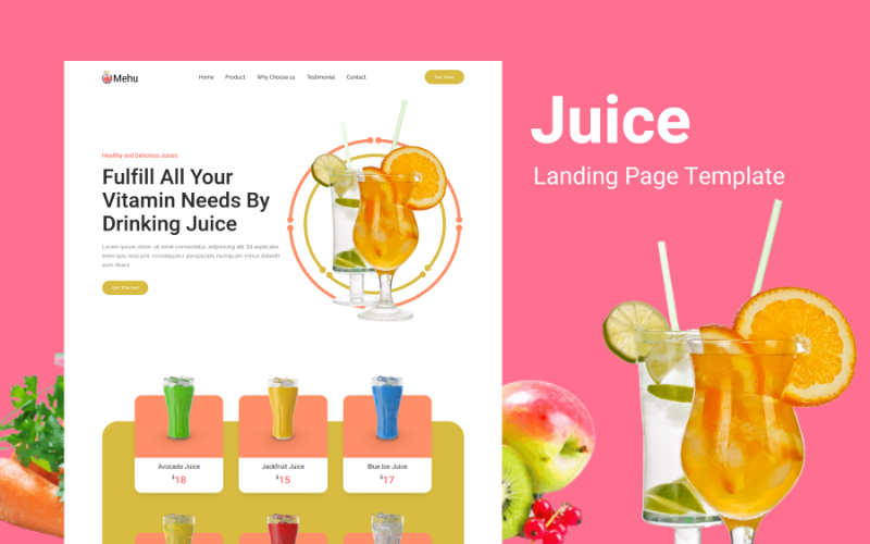 Mehu Juice Landing Page Template, perfect for businesses in the juice and smoothie industry. This template is designed to showcase your products and services in a visually appealing way, with a clean and modern layout that is easy to navigate. With customizable colors and fonts, you can easily tailor the template to match your brand's unique style. Whether you're just starting out or looking to refresh your online presence, our Juice Landing Page Template is the perfect solution for your business. Get started today and start attracting more customers to your juice bar or smoothie shop!