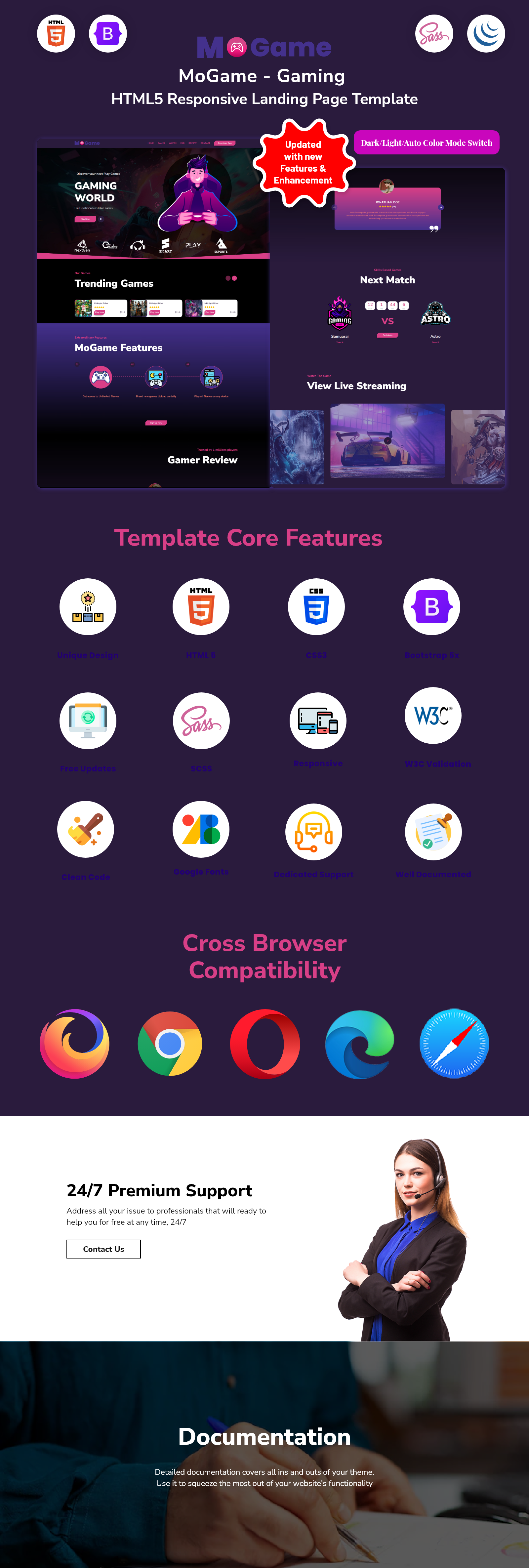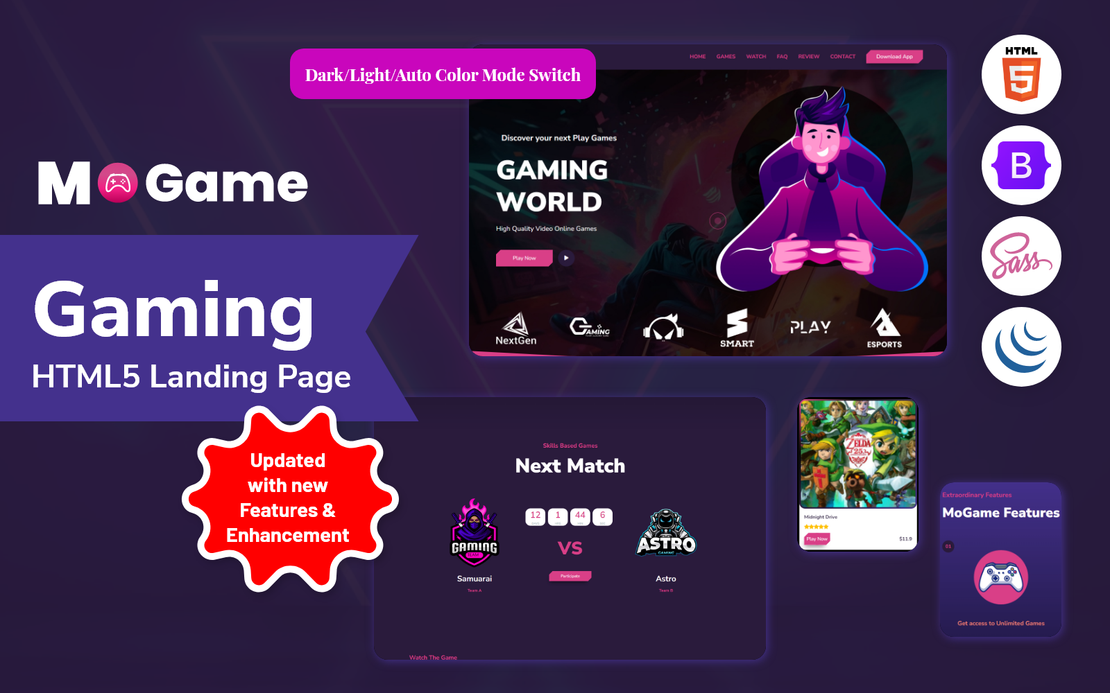 MoGame built with SCSS, HTML5, Bootstrap framework, 100% responsive, and valid HTML coding on all device types online gaming landing page template. This landing page template is intended for publishing websites and information related to online games which is easily customizable. This landing page template includes the latest gaming features. Used a slider related to trending games and created a section to provide customer reviews. Along with this, a countdown timer has been given for the time of the upcoming match, which is enough to arouse curiosity in the hearts of gamers. Along with this, smooth animation transition has been used in it. It is visually appealing and coordinated.