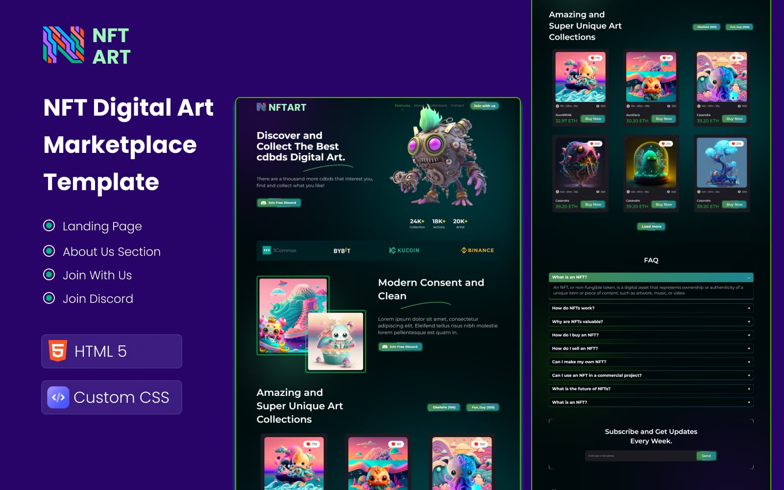 Monster NFT is a premium NFT Marketplace HTML Landing Page Template. It is a modern, stylish, and responsive template that is perfect for creating a professional and engaging NFT marketplace. The template is SEO-friendly, easy to use, and customized, and it includes a variety of features that will help you create a successful NFT marketplace.