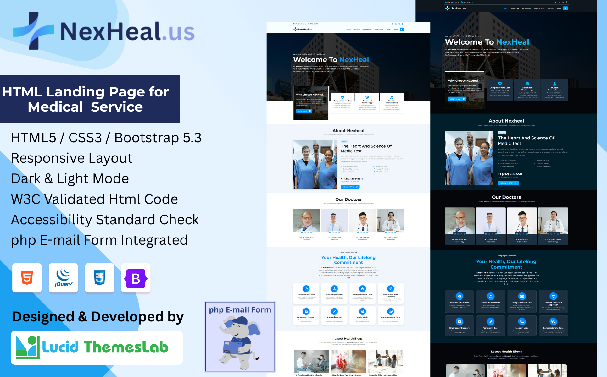 NexHeal is a professional healthcare and medical website template designed for hospitals, clinics, doctors, healthcare centers, and medical professionals who want to create a trustworthy online presence. Built with HTML5, CSS3, Bootstrap, and jQuery, NexHeal ensures fast performance, clean design, and full responsiveness across all devices. With a dark/light mode switcher, smooth animations, and an intuitive layout, your patients and visitors will enjoy a seamless browsing experience. It includes working PHP mail integration for contact forms and newsletter subscriptions, making it easier to stay connected with patients. The template is W3C validated, SEO-friendly, and accessibility-tested, ensuring it meets high-quality standards. NexHeal is easy to customize—whether you are a developer or healthcare provider, you can quickly adapt the template to match your branding and services. It’s the perfect solution for showcasing medical services, doctor profiles, patient care information, and booking appointments online.
