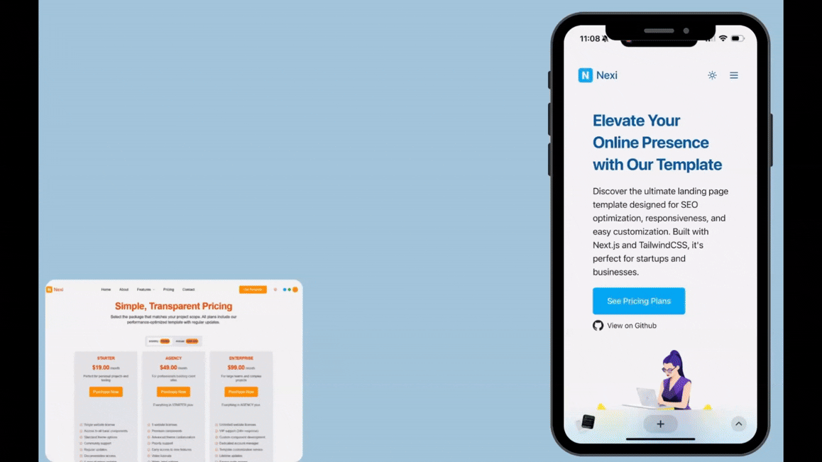 This premium template transforms your online presence with sleek, conversion-optimized layouts. Featuring a stunning landing homepage, services showcase, pricing section, about section, and contact page - all built with cutting-edge Next.js and Tailwind CSS for unmatched performance.