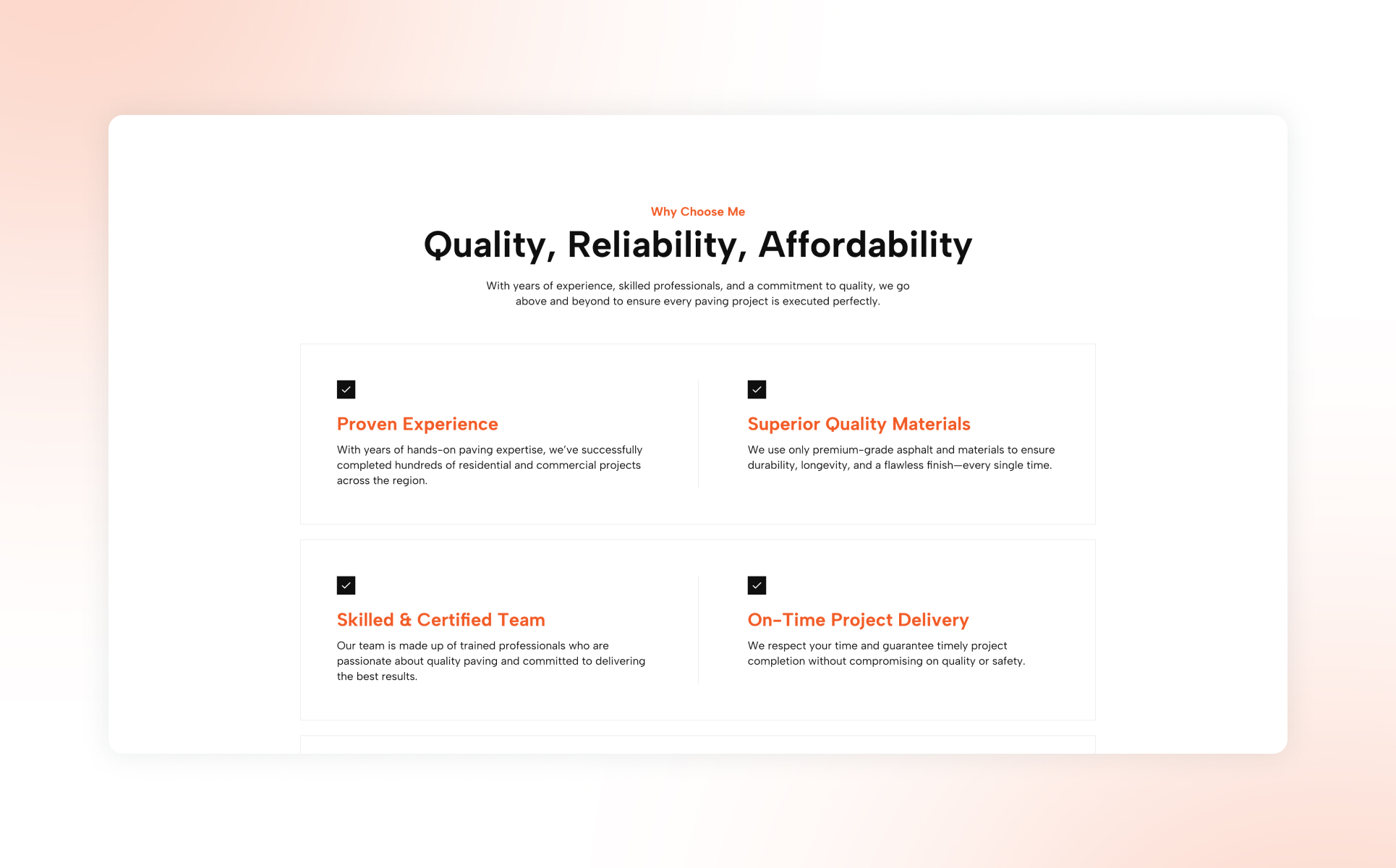 With SEO-optimized code, clean design, and cross-browser compatibility, PavifyPro ensures your business not only looks professional but also ranks well in local search. It's also fully customizable, allowing you to match the branding and tone of your paving company without any coding.