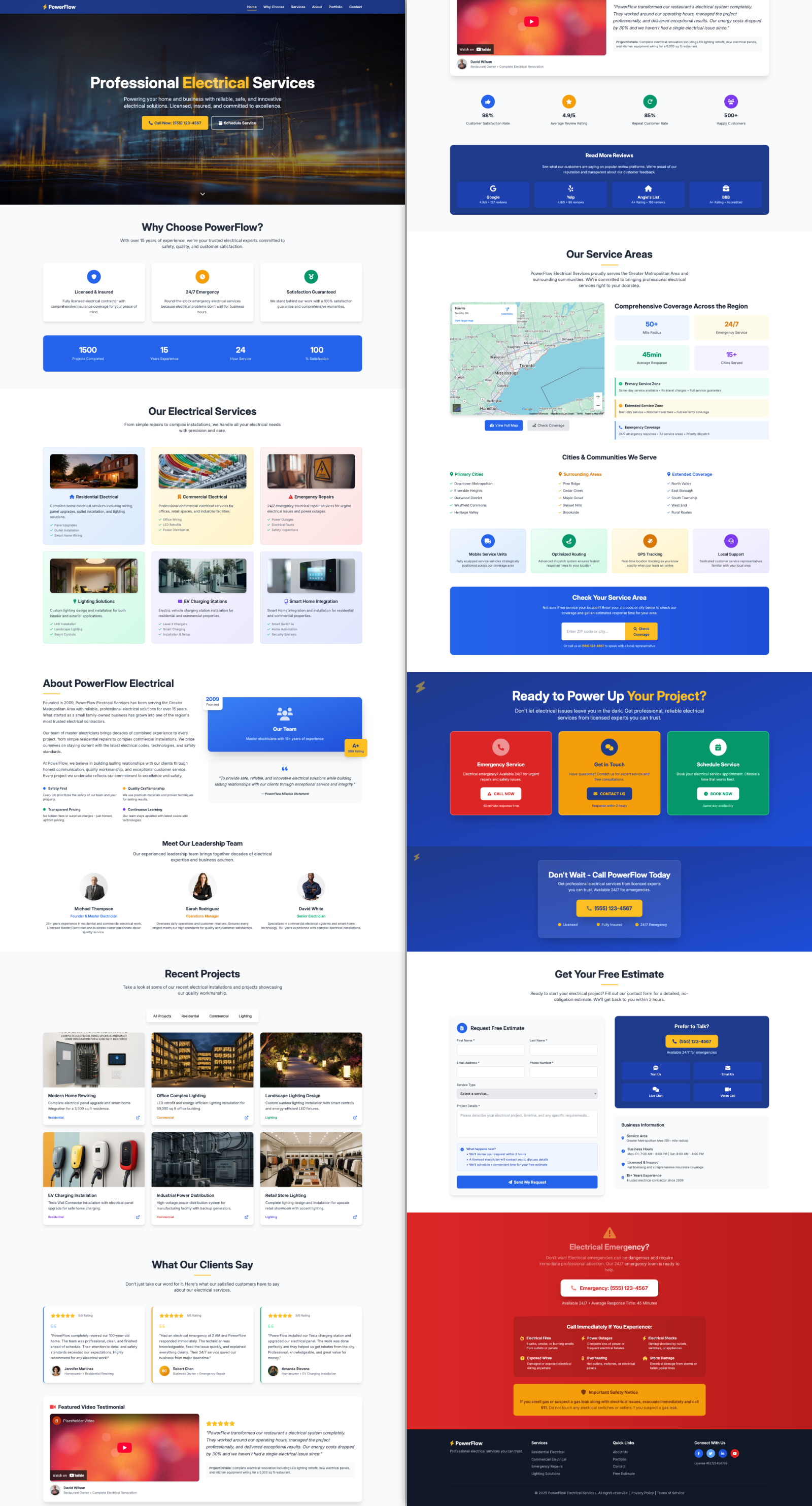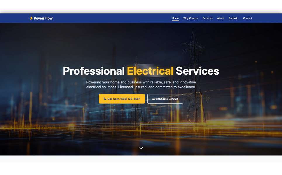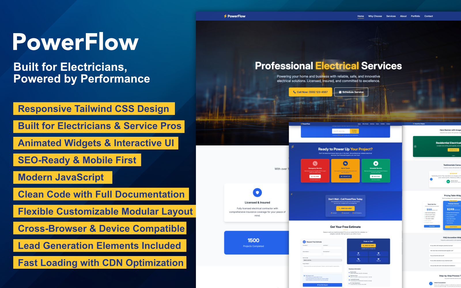 The PowerFlow template is a responsive, high-performance HTML template designed specifically for electrical contractors, service-based businesses, and industrial providers. Built with HTML5, Tailwind CSS, and Vanilla JavaScript, it delivers modern design and superior usability without jQuery dependencies. This template includes a full suite of design and technical features such as mobile-first layouts, accessibility compliance (WCAG 2.1), SEO-optimized structure, and cross-browser compatibility.