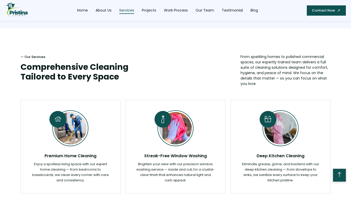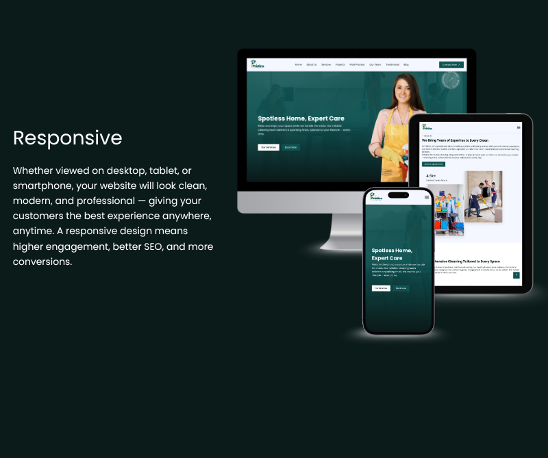 Whether you offer residential cleaning, commercial sanitization, deep kitchen cleans, or specialty services, Pristina helps you present your brand professionally and convert more visitors into clients.