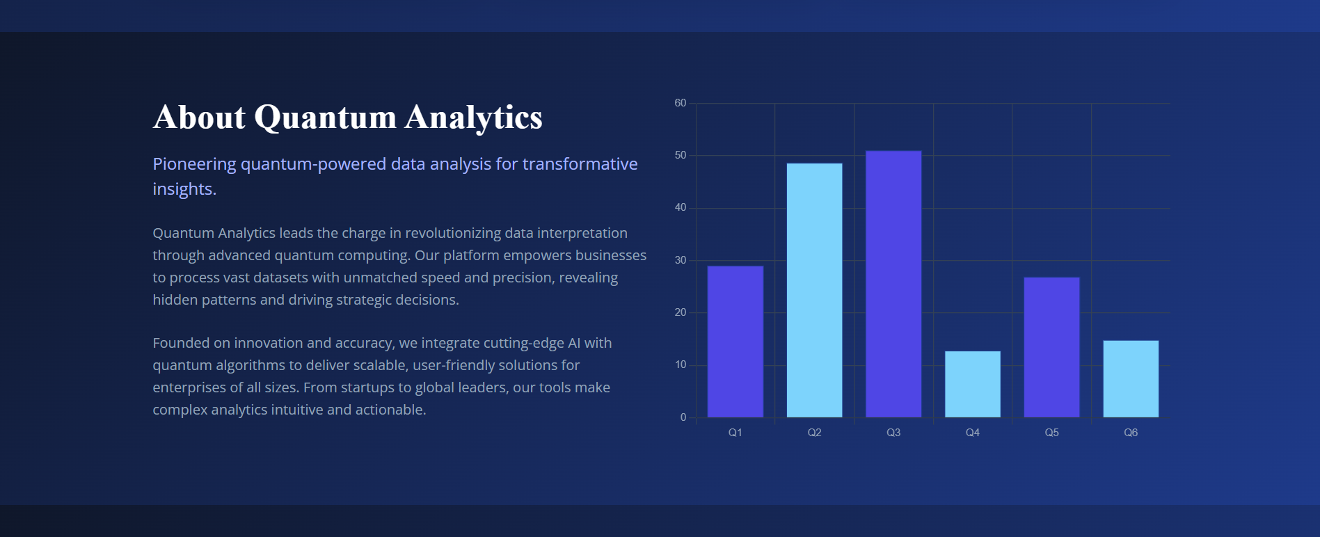 With Quark Insights, you gain a powerful foundation to create a professional, adaptable, and captivating website that reflects the precision of data analytics. Engage your audience, showcase your transformative insights, and amplify your online presence with a template built for the future of data.