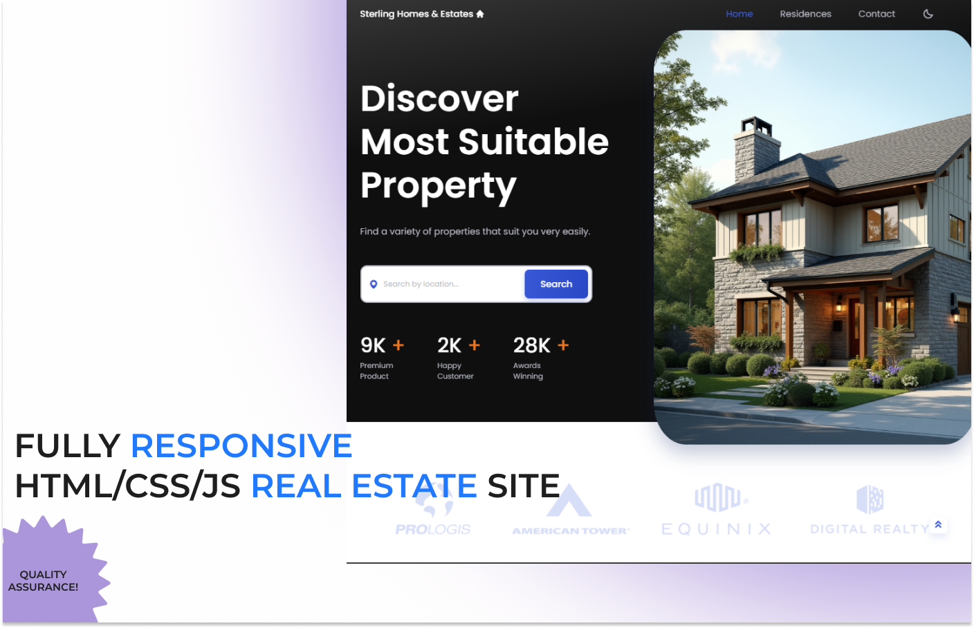 The Responsive Real Estate Website by MasterGuram is a sleek, professionally crafted front-end template designed to meet the needs of modern real estate businesses, property agents, or housing platforms. Built using HTML, CSS, and JavaScript, this responsive, mobile-first website delivers a clean and attractive layout that ensures optimal performance across desktops, tablets, and smartphones.