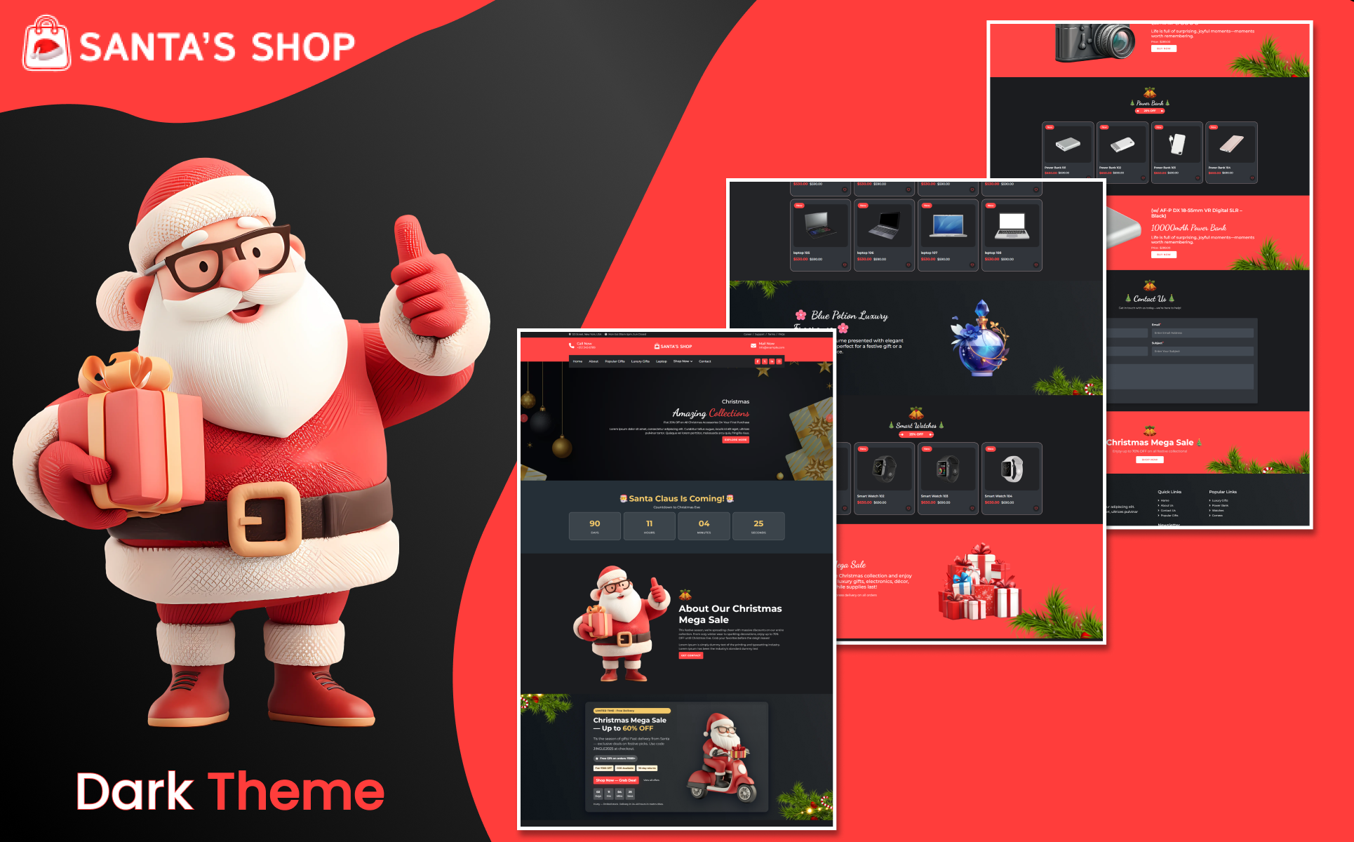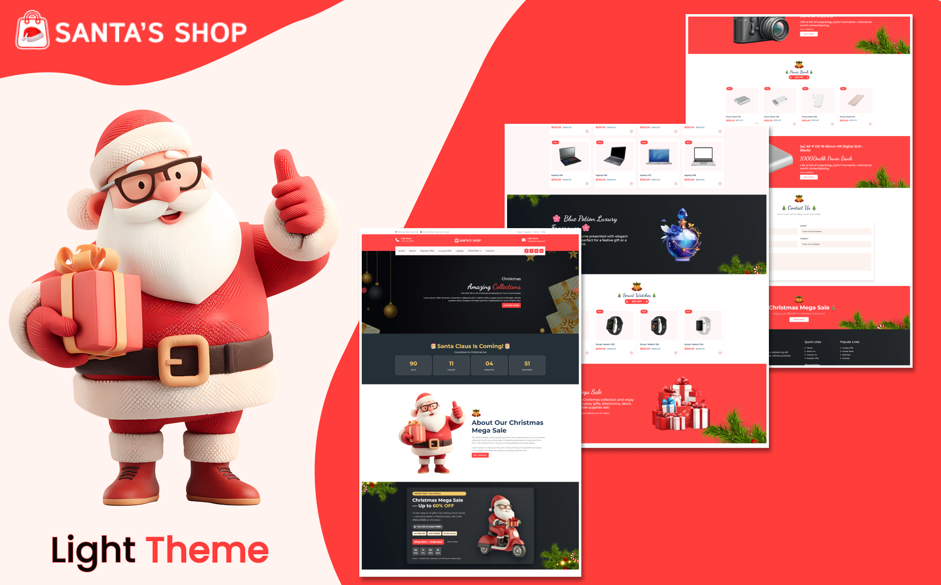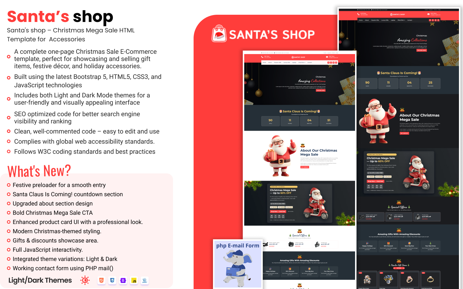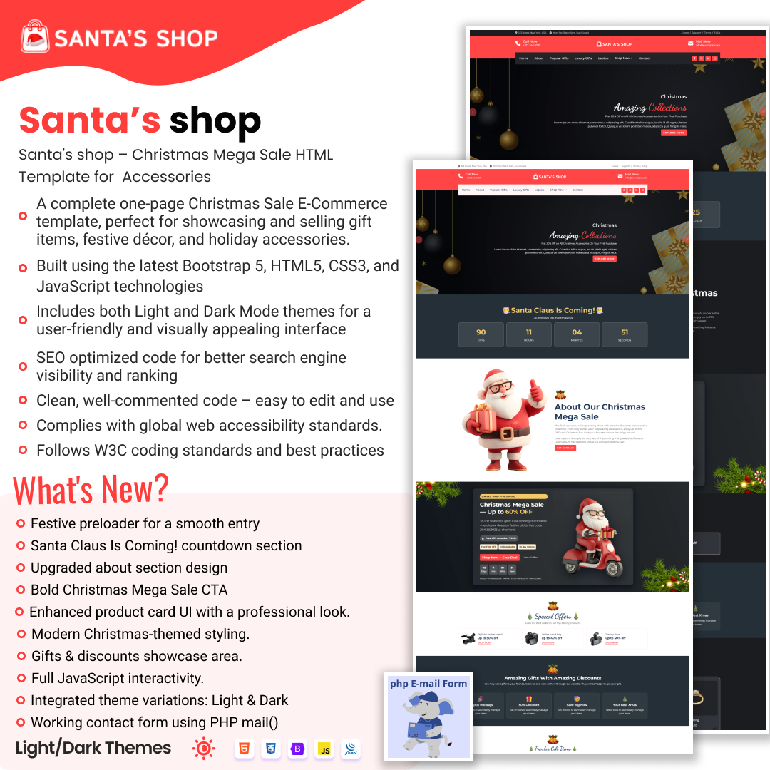 Celebrate the festive season with SantaShop, Sale, a high-converting one-page ecommerce landing page template designed for online electronics and gadget stores. Built with the Bootstrap 5 framework and powered by HTML5, CSS3, and JavaScript, this template blends a cheerful holiday vibe with performance-driven coding to create a shopping experience your customers will love.Switch effortlessly between Light & Dark theme modes, enjoy smooth scrolling navigation, and showcase your best holiday deals through interactive product sections and sliders. Whether you’re running a limited-time Christmas offer, launching new gadgets, or promoting year-end discounts, Christmas Mega Sale helps you maximize conversions while keeping your store stylish, fast, and user-friendly.