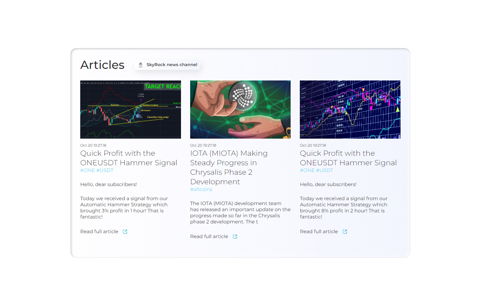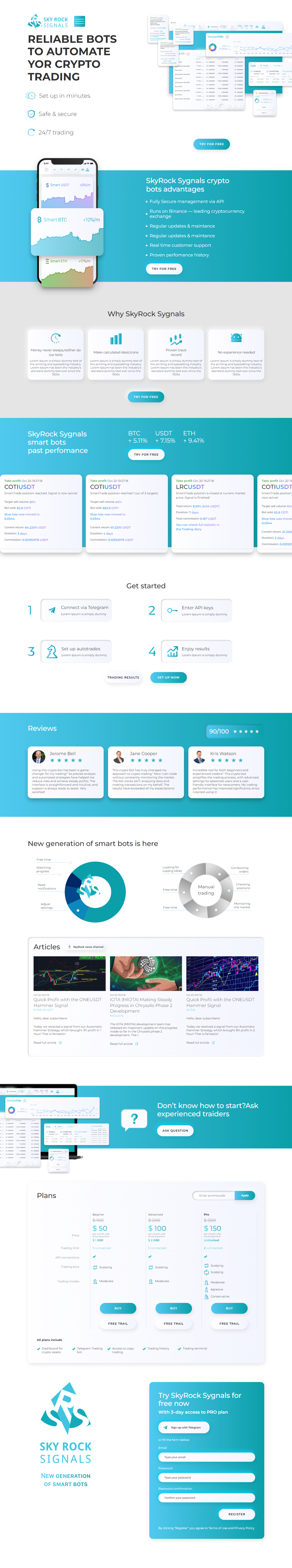 "Sky Rock" html template. The template is ideal for the display page of your crypto exchange. The first block on the page will introduce potential customers to your company's strengths. And the next block will add even more specifics on them. Next, one of the main blocks. This is a running time with contacts that pass through your exchange. There can be any number of contracts, and when hovering over a contract, the animation stops. The next block is an instruction on how to start working with you. There is also a block with reviews on the site. There are currently three reviews available. There are also several diagrams on the site. If you want to replace them, you will have to draw a new picture or change the value in the current one. You can also see the news section on the website. Next, we have a block with tariffs. And the last block is the registration form. Most of the buttons on the page lead to this form.