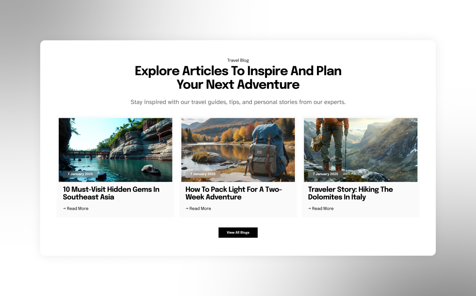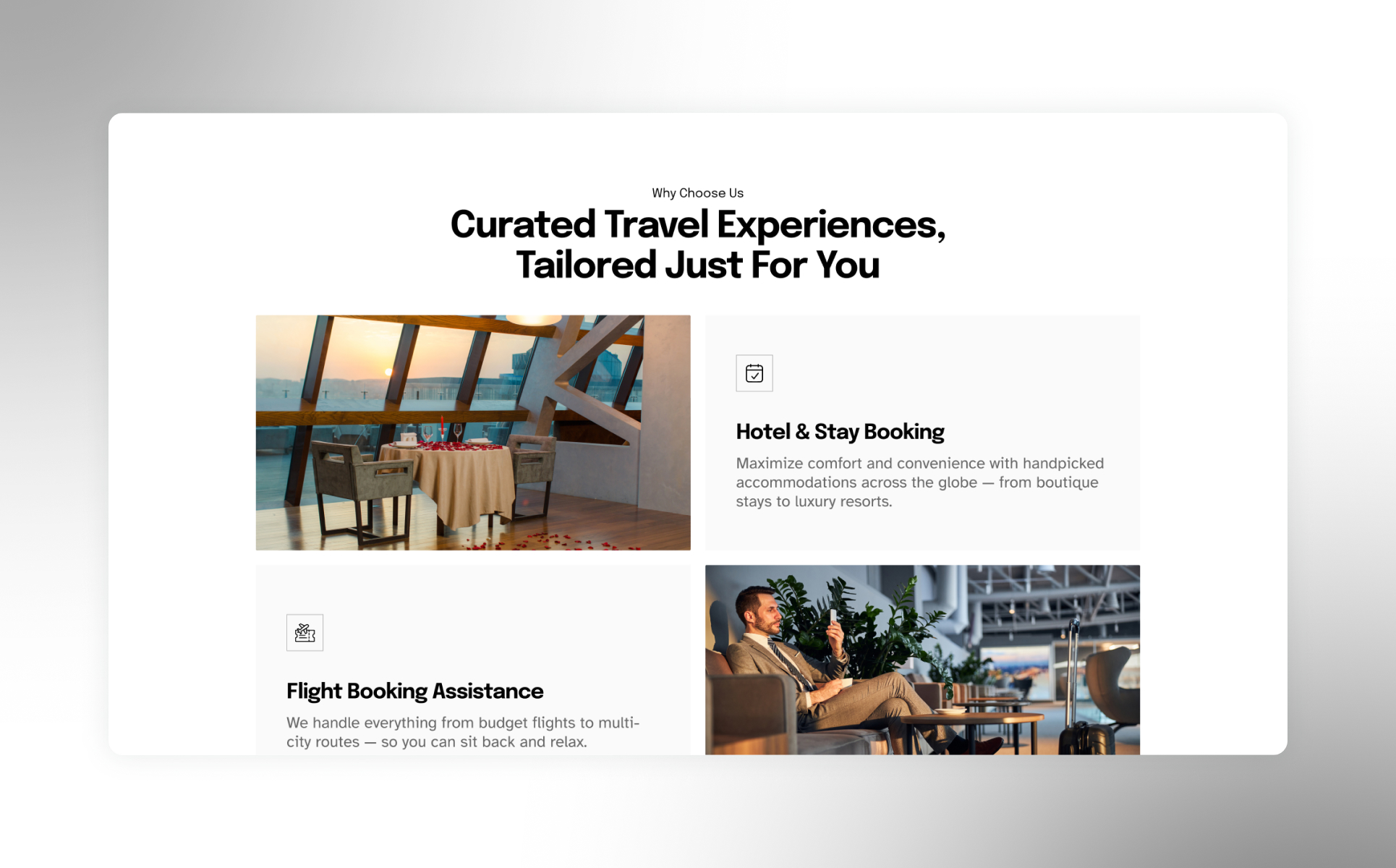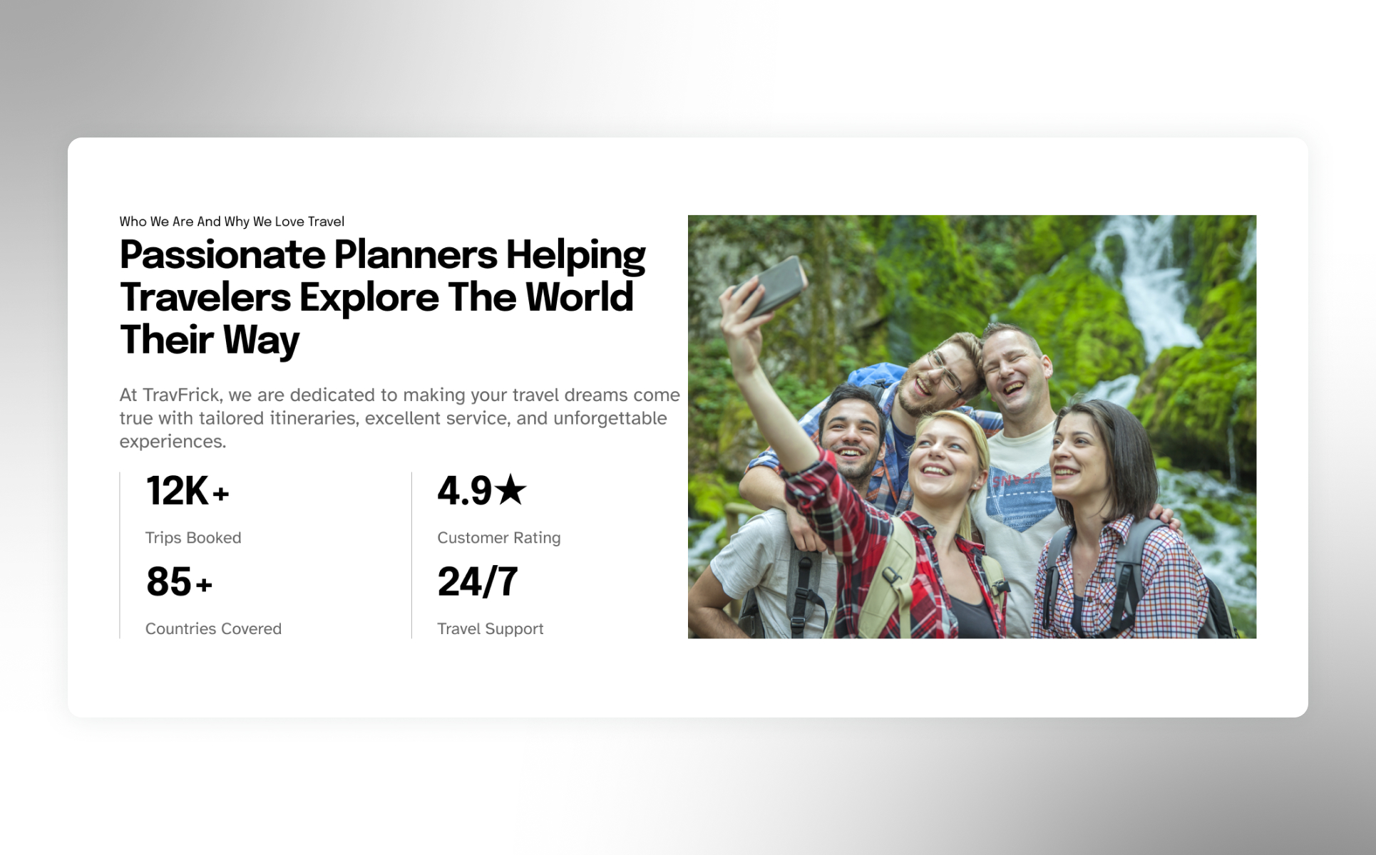 Whether you’re a small travel consultant or a large tour company, Travfrick gives you a professional website designed to inspire, inform, and convert.