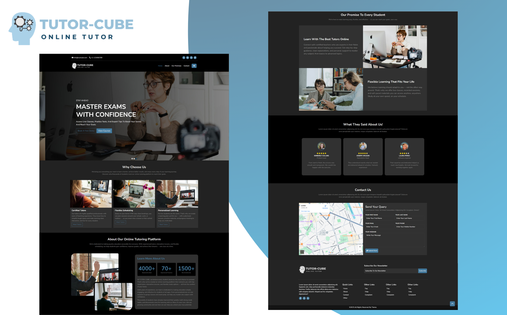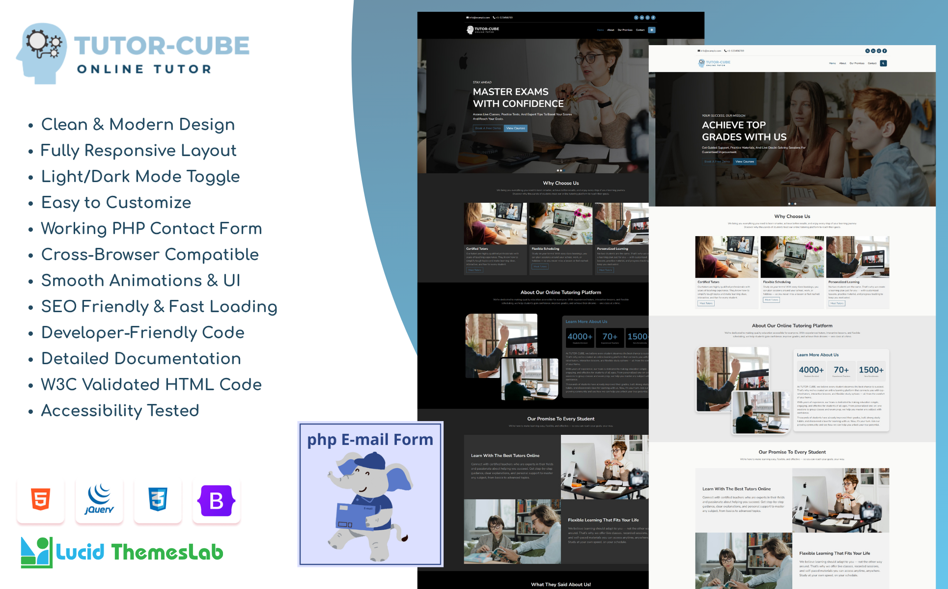 Launch your online teaching or tutoring business with this clean, modern, and fully responsive HTML landing page template. Designed for tutors, educators, and online course sellers, this template makes it easy to promote your services and connect with students. Built with HTML, CSS, Bootstrap 5 and Splide JS for smooth sliders and interactive sections, it’s 100% W3C validated, optimized for accessibility standards, and supports both light and dark modes for a great user experience. Customize it effortlessly — the code is well-organized and beginner-friendly. The working PHP contact form makes it simple for students to get in touch or book a demo class.