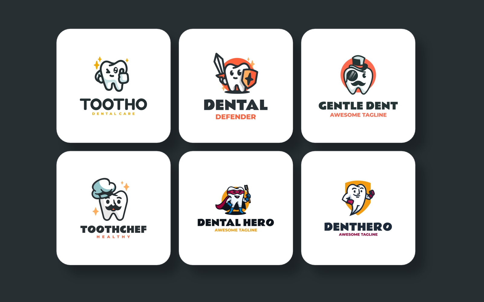 6 Mascot Dental Logos Cute Cartoon Character Set Logo Template