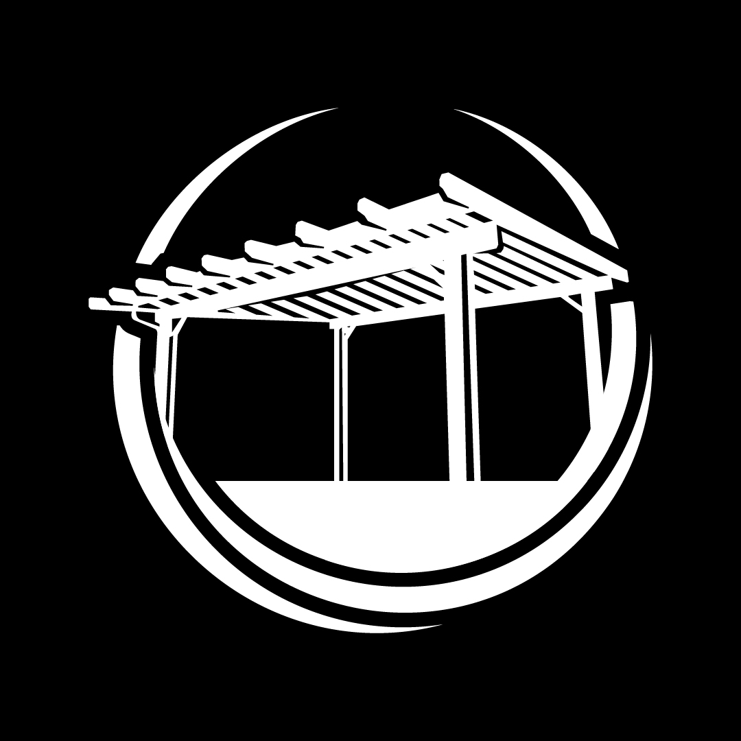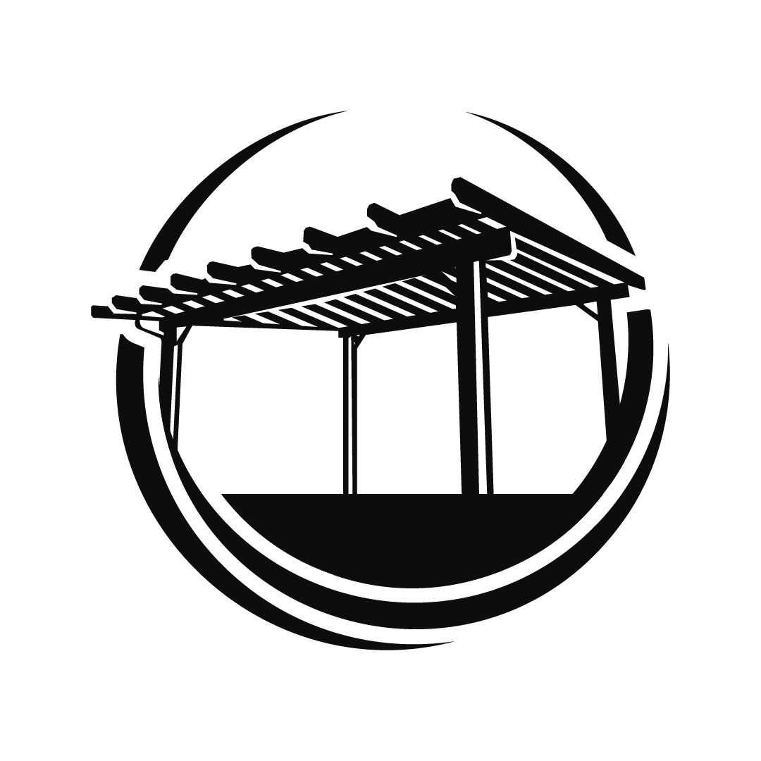 A perfect logo for builders who specialize in pergolas, sheds, and pavilions with images of wooden pergolas isolated on a clean white background. The design features a sleek cedar wooden pergola on a white backdrop, showcasing the timeless elegance of wooden pergolas.
