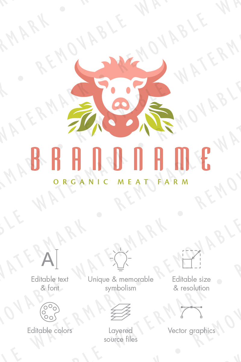 Logo template with idea of pig head incorporated into cow head. Organic element is represented with leaves and grass decoration. Theme can be interesting for food producers, organic meat farms, butcheries, groceries, cooking brands, restaurants, agriculture industry and similar.