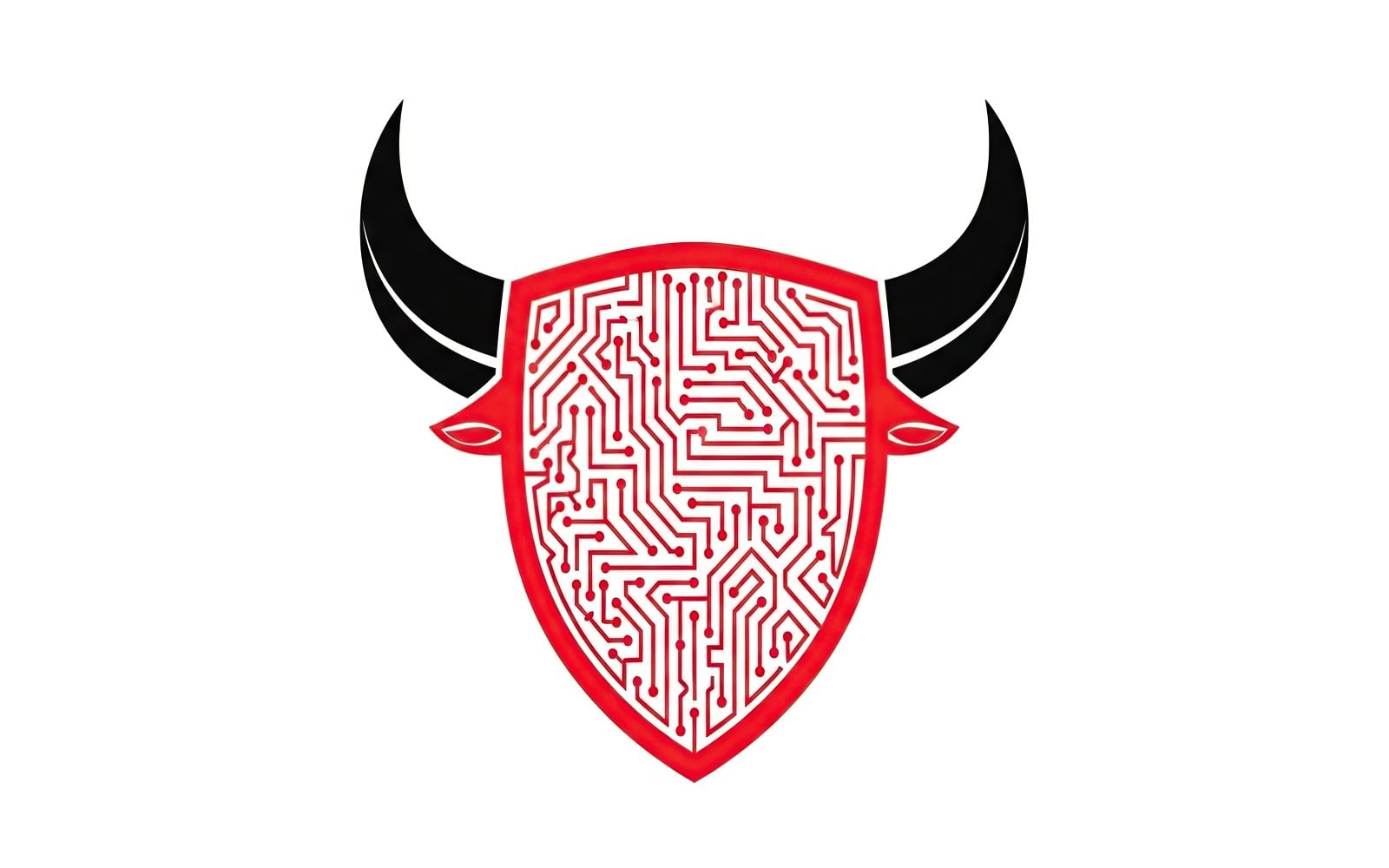 Bull head with black horns and red shield filled with circuit board pattern, logo design, vector Logo Template