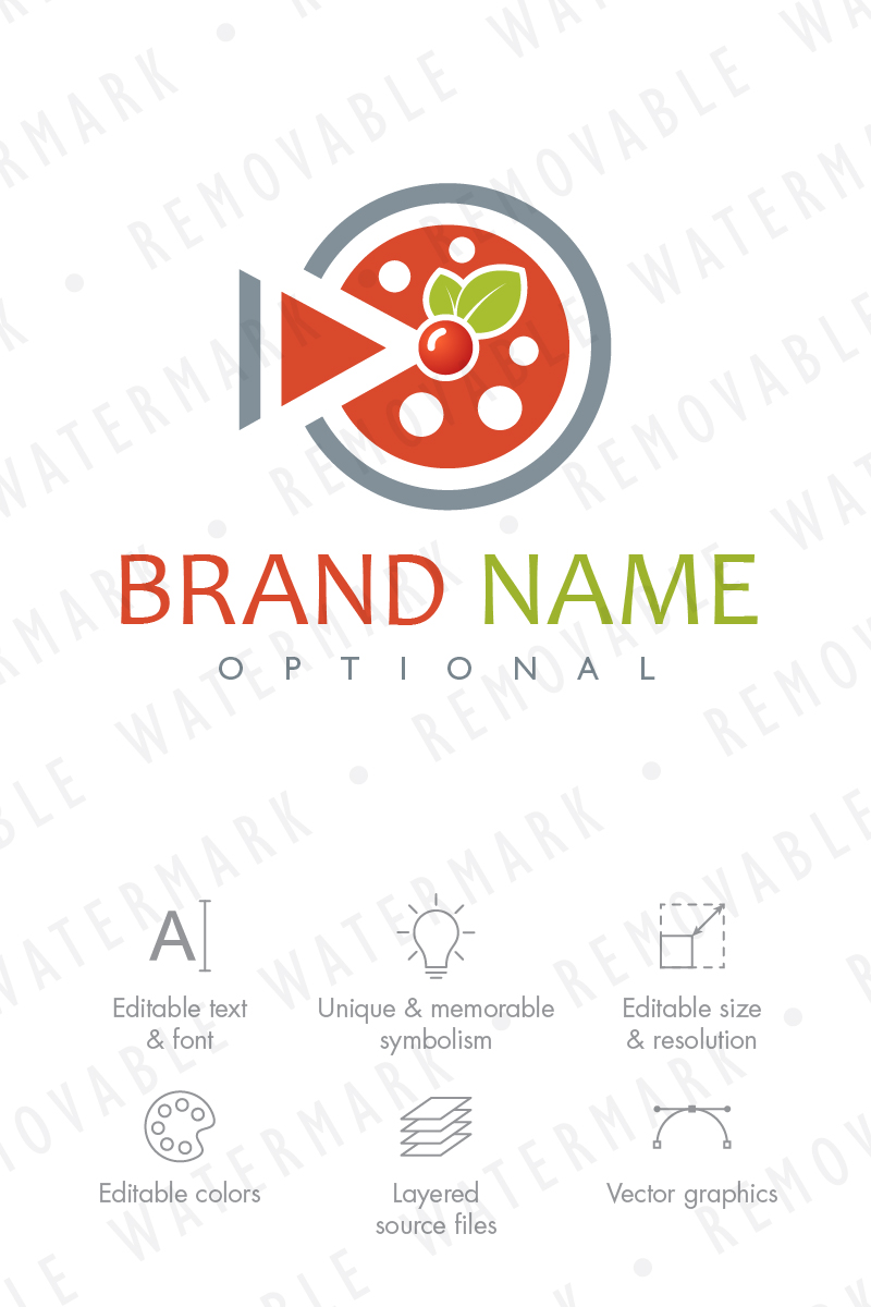 Logo template with idea of stylized cherry pie (also resembling film reel in very organic way). Media symbol is represented by "piece of cake" and thus can symbolize accessibility.