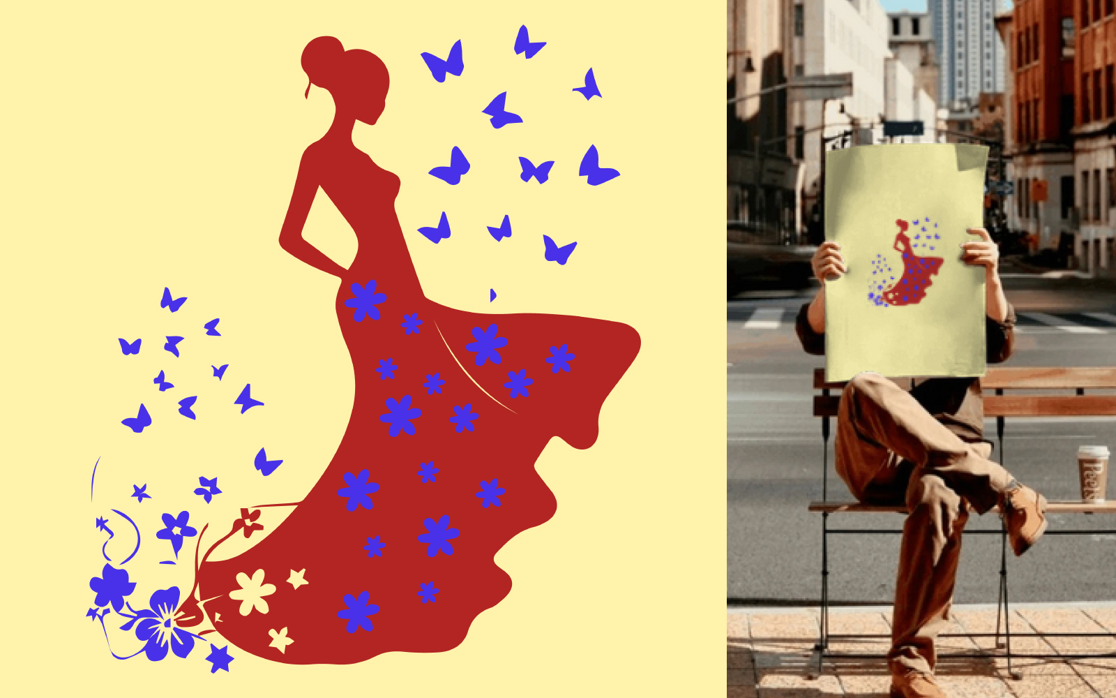 This elegant vector illustration features the silhouette of a graceful woman in a flowing red dress adorned with floral patterns and surrounded by vibrant butterflies. The design combines femininity, fashion, and creativity, making it perfect for branding, invitations, posters, t-shirt prints, fashion magazines, and digital artwork. With its modern, minimalist yet artistic style, this template is ideal for beauty brands, fashion designers, lifestyle bloggers, and creative businesses looking to add a touch of sophistication and charm to their projects.