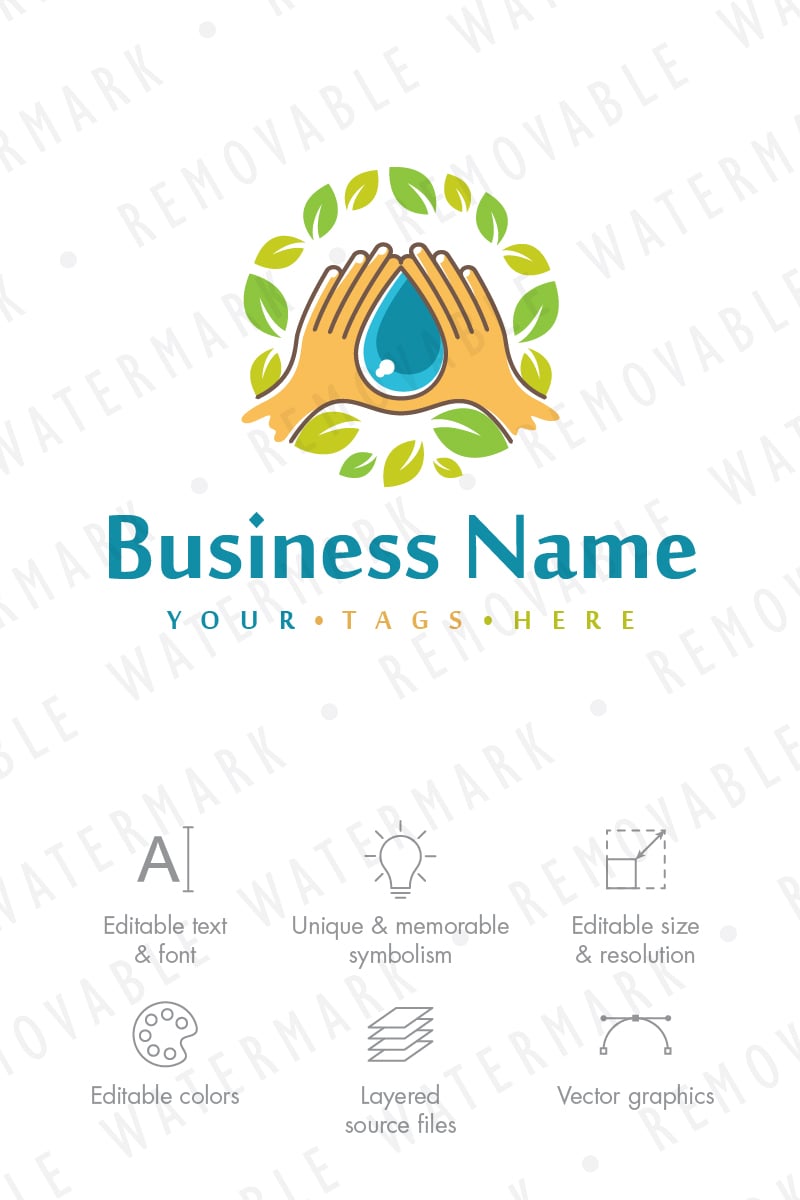 Logo template with idea of water drop shape formed within space between human hands gesture. Hands can symbolize gift, charity or aid, while water droplet has very obvious symbolism of its own. Circle of leaves represents natural element in design. Theme can be interesting for spa, natural medicine or charity brands, water energy and environmental companies or any business related to water symbolism.