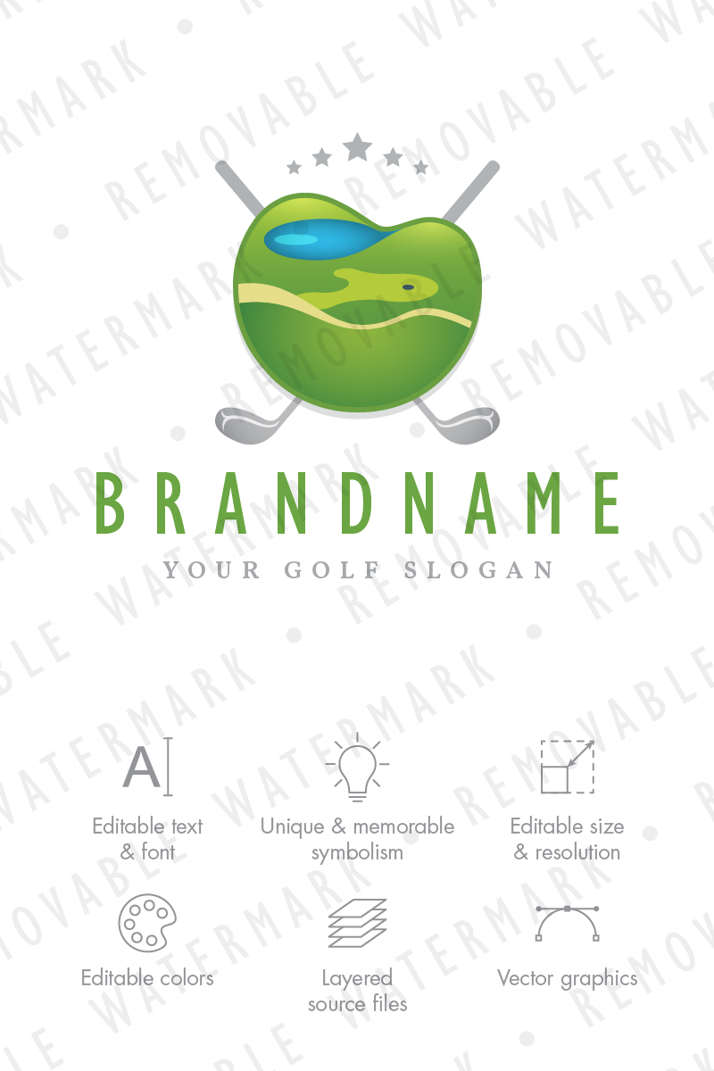 Logo template with idea of stylized emblem designed as golf course landscape with crossed golf clubs behind it. Theme can be interesting for golf clubs, golf fashion and accessory companies, landscaping services, golf championships and events, golf resorts, restaurants or any other business related to golf symbolism.