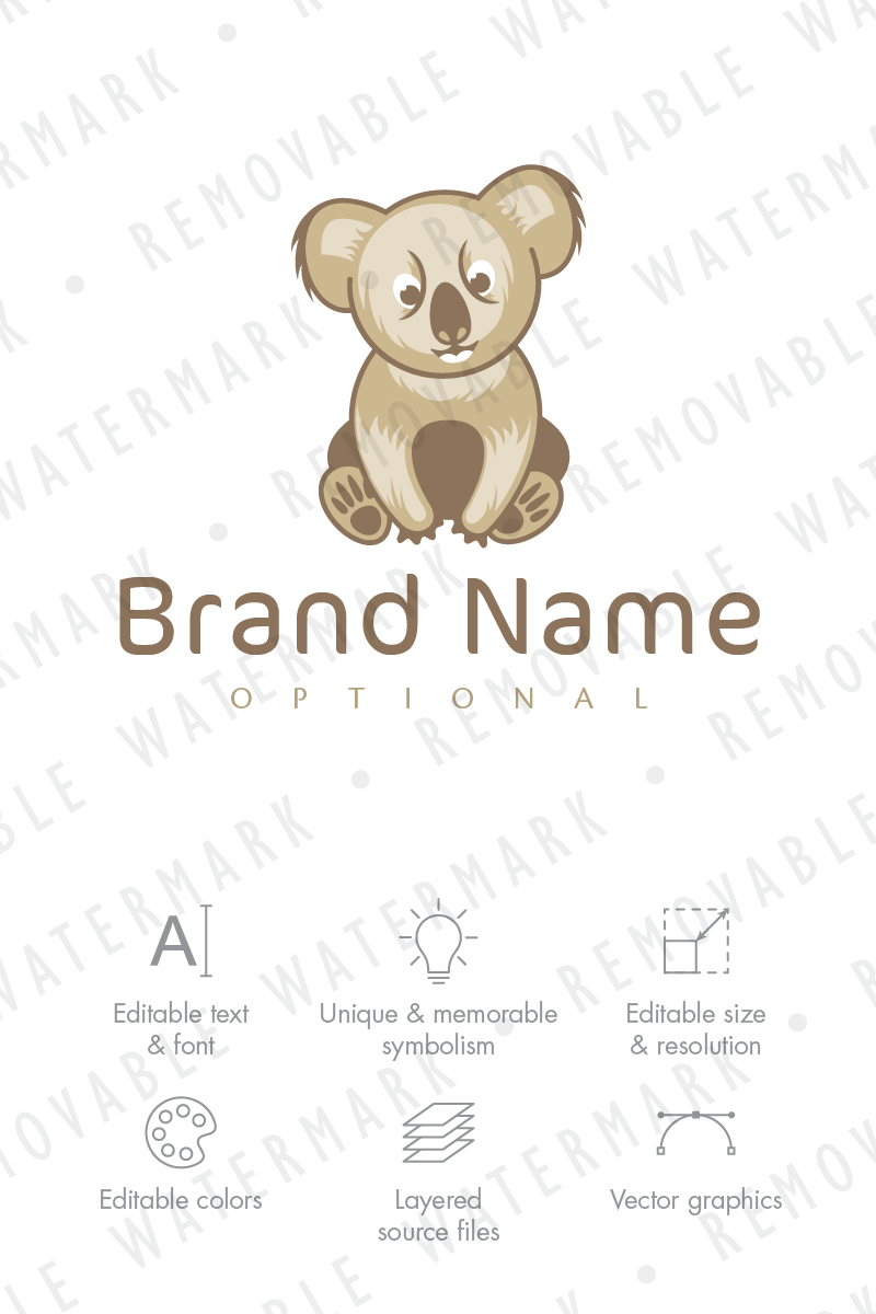 Logo template with idea of sitting koala mascot or character. Koala symbolism is commonly associated with memory, connection, trust, calm, pleasure, relaxation and dreaming. Theme can be interesting for gift shops, toy stores, pet shops, zoo gardens, childcare companies and similar.