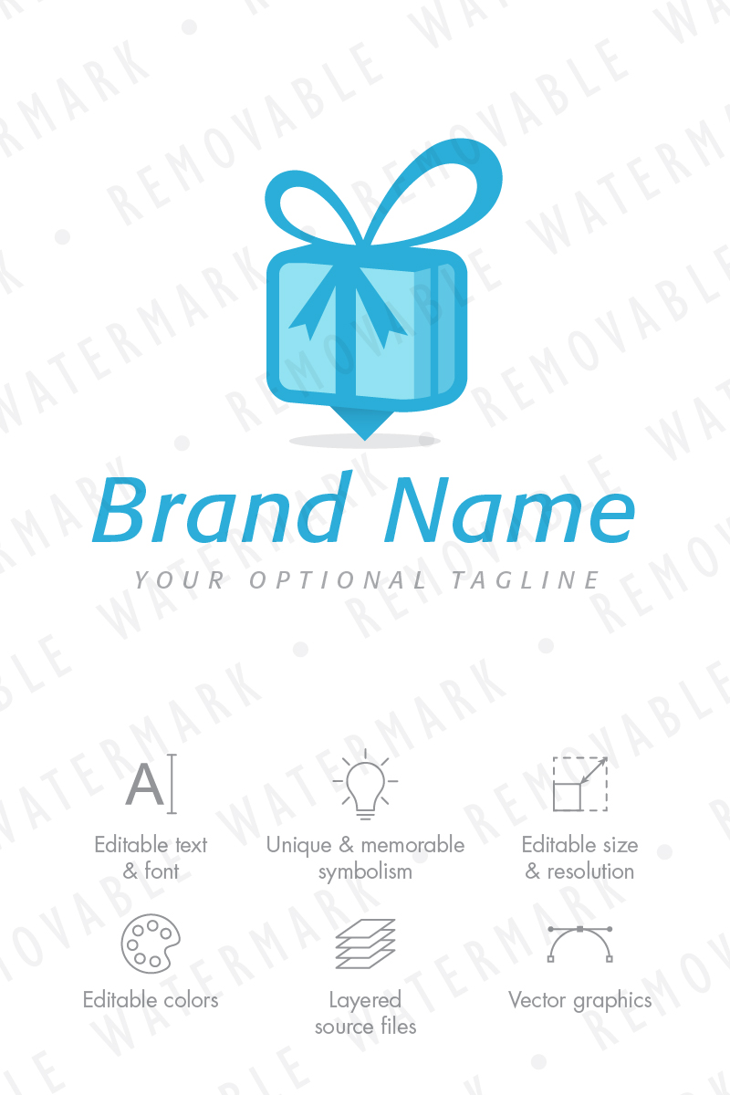 Logo template with idea of stylized gift box, with its bottom part designed to resemble pin or location marker.